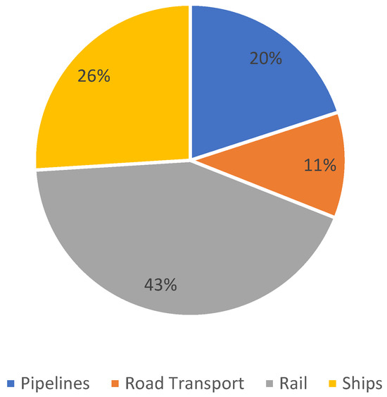 In most cases, ammonia distribution relies on a combination of transportation modes to deliver the product from the production site to its final destination. In the United States, the modal share of ammonia transportation in 2017 is presented in Figure 1.