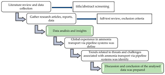 To ensure the selection of high-quality and relevant documents, the authors applied specific inclusion and exclusion criteria. The inclusion criteria encompassed peer-reviewed articles published in the last ten years, studies focusing on ammonia transportation technologies, articles available in English, and papers providing detailed methodological descriptions. The exclusion criteria ruled out non-peer-reviewed articles and grey literature, studies published more than ten years ago (unless they are seminal works), articles not available in full text, and documents not directly related to the topic.