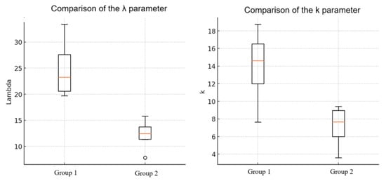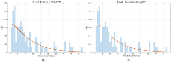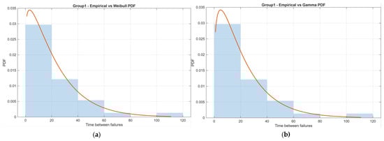 Comparison of fitted probability density functions (PDFs) for Group 1. (a) Empirical vs. fitted Weibull distribution (λ = 14.834, k = 1.262). (b) Empirical vs. fitted Gamma distribution (α = 2.097, β = 7.071). Both models describe the observed time-between-failure data well, as indicated by high p-values (0.9433 and 0.9586, respectively). The Weibull distribution was selected as the primary model owing to its physical interpretability and slightly better AIC/BIC performance.