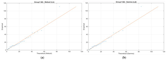 QQ-plots for Group 1. (a) Weibull distribution (λ = 14.834, k = 1.262). (b) Gamma distribution (α = 2.097, β = 7.071). The QQ plots confirm a close alignment between theoretical and empirical quantiles for both models, validating the goodness of fit observed in the PDF analysis.