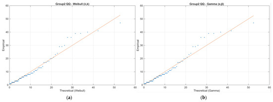 QQ-plots for Group 2. (a) Weibull distribution (λ = 10.912, k = 0.908). (b) Gamma distribution (α = 1.333, β = 8.232). Deviations are minor and occur mainly in the upper quantile region. Both distributions approximate the data well, with the Weibull showing slightly better performance based on AIC/BIC and interpretability criteria.