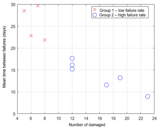 Based on the analysis of the number of failures and the mean time between successive failures, a classification of vessels was performed using the k-Means algorithm. The input data for clustering included: