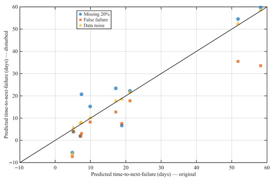 Sensitivity analysis was used to evaluate the robustness of predictive models against data quality variations. The three disturbance scenarios—missing historical data, false failure entries, and random noise—simulate real-world data imperfections. By re-estimating the Weibull parameters and regression coefficients after each perturbation, we quantified how prediction stability depends on data completeness and accuracy. This approach aligns with best practices in reliability engineering, where assessing the sensitivity of model outputs to uncertain inputs is essential for ensuring operational applicability.