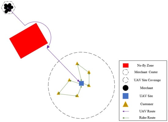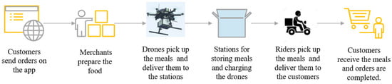 The rapid development of drone delivery services has created new opportunities for enhancing urban logistics networks [4]. Building upon established collaborative delivery concepts [5,7], this study addresses the critical challenge of optimizing food delivery in complex urban environments through a novel drone–rider joint delivery system, with the operational workflow illustrated in Figure 1.