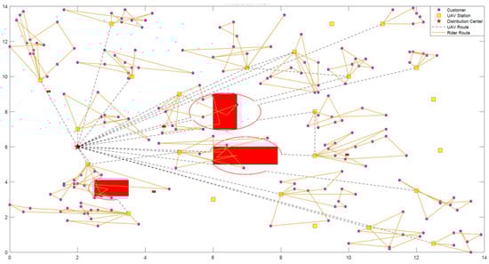 In Figure 4, the legend in the upper-right corner corresponds to Table 5, Table 6 and Table 7, respectively. Table 8 relates to the red no-fly zones shown in the figure (there are seven no-fly zones in total, four of which intersect with the UAV flight trajectories). Specifically: The first legend entry, “Customer,” refers to the 30 customer points selected from the modified Solomon dataset C101, as provided in Table 7. The second entry, “UAV Station,” corresponds to the XY coordinates representing the centers of the yellow rectangles, detailed in Table 6. The third entry, “Distribution Center,” is associated with the data in Table 5.