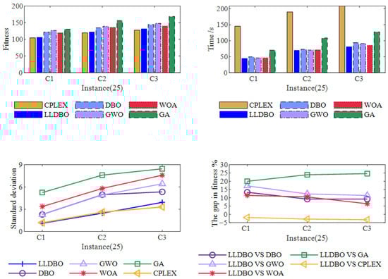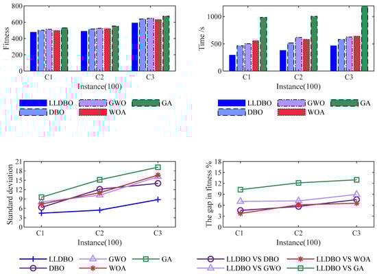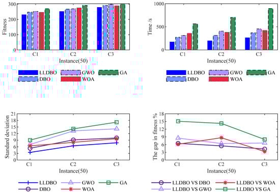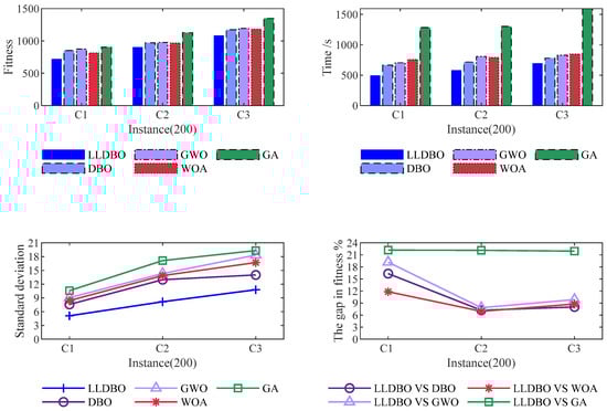 In order to verify the effectiveness of the Improved Dung Beetle Algorithm (LLDBO), the experimental instances of 25 customer points, 50 customer points, 100 customer points, and 200 customer points are each run with the Improved Dung Beetle Algorithm (LLDBO), the CPLEX Exact Algorithm (CPLEX), the Conventional Dung Beetle Algorithm (DBO), the Grey Wolf Algorithm (GWO), the Whale Optimization Algorithm (WOA), and the Genetic Algorithm (GA), respectively. Run 200 times, each of the four sizes of experimental instances has three improved Solomon datasets. The comprehensive performance comparison of all algorithms for the 200-customer scenario is detailed in Table 10, 25-customer-point experimental results are shown in Figure 6, 50-customer-point experimental results are shown in Figure 7, 100-customer-point experimental results are shown in Figure 8, and 200-customer-point experimental results are shown in Figure 9.
