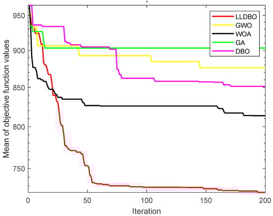 Customer satisfaction analysis reveals that LLDBO maintains higher service levels across all problem scales, with particularly notable advantages in large-scale instances (93.47% vs. 90.95% for standard DBO in 200-customer case). The convergence characteristics shown in Figure 10 further confirm LLDBO’s efficiency, demonstrating faster convergence to better solutions compared to other metaheuristic approaches.