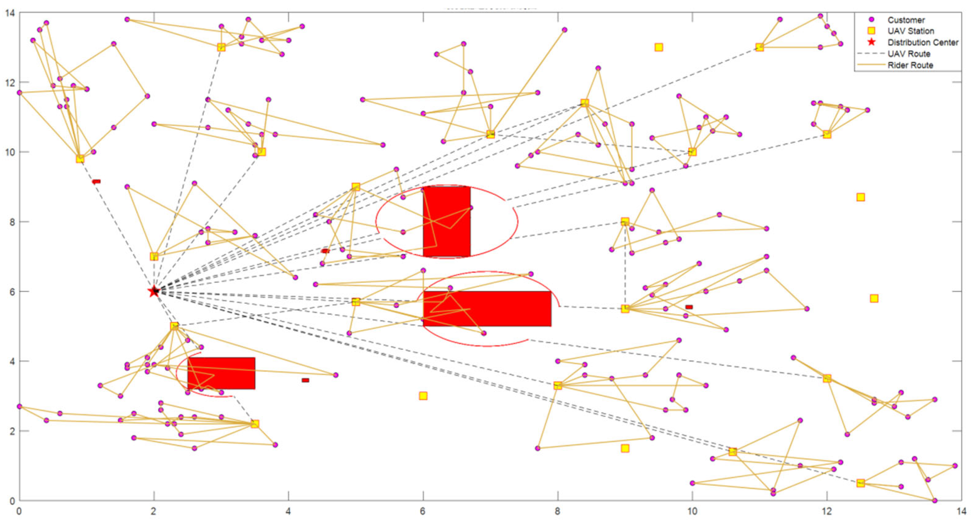 Figure 4, the drone picks up the meal from the merchant and delivers it to the drone site at the merchant’s gathering point, and in the process, if it passes through the red no-fly zone, it will use the obstacle avoidance strategy proposed in this paper to make a detour; and then the rider picks up the meal from the corresponding drone site and delivers the meal to the customer’s hands, and the rider’s service radius surrounds around the drone site, which is usually no more than a 1km radius, because it takes time for the drone to take off and land, so the short-distance delivery riders have more advantages than drones, and the rider service radius is determined by the AP clustering algorithm. The real urban environment drone delivery obstacle avoidance routing problem is shown in