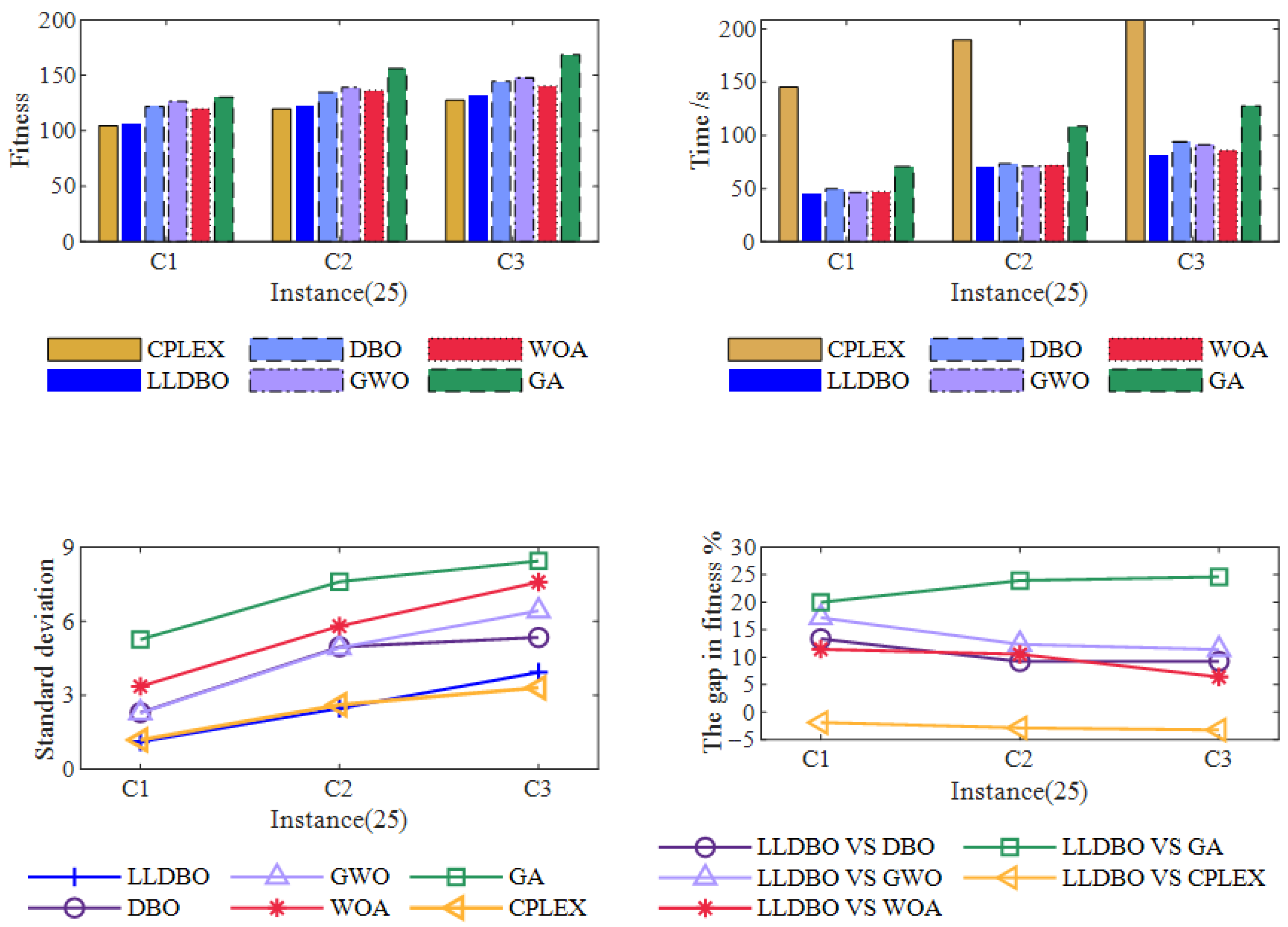 The optimal value, worst value, average value, standard deviation and average customer satisfaction of LLDBO are optimal for all six algorithms at different scales. The CPLEX algorithm has a similar optimal value to the LLDBO algorithm in solving the 25-customer-point problem, but the running time is much longer than that of the LLDBO algorithm, and the CPLEX algorithm is unable to solve it when dealing with large-scale problems, so only
