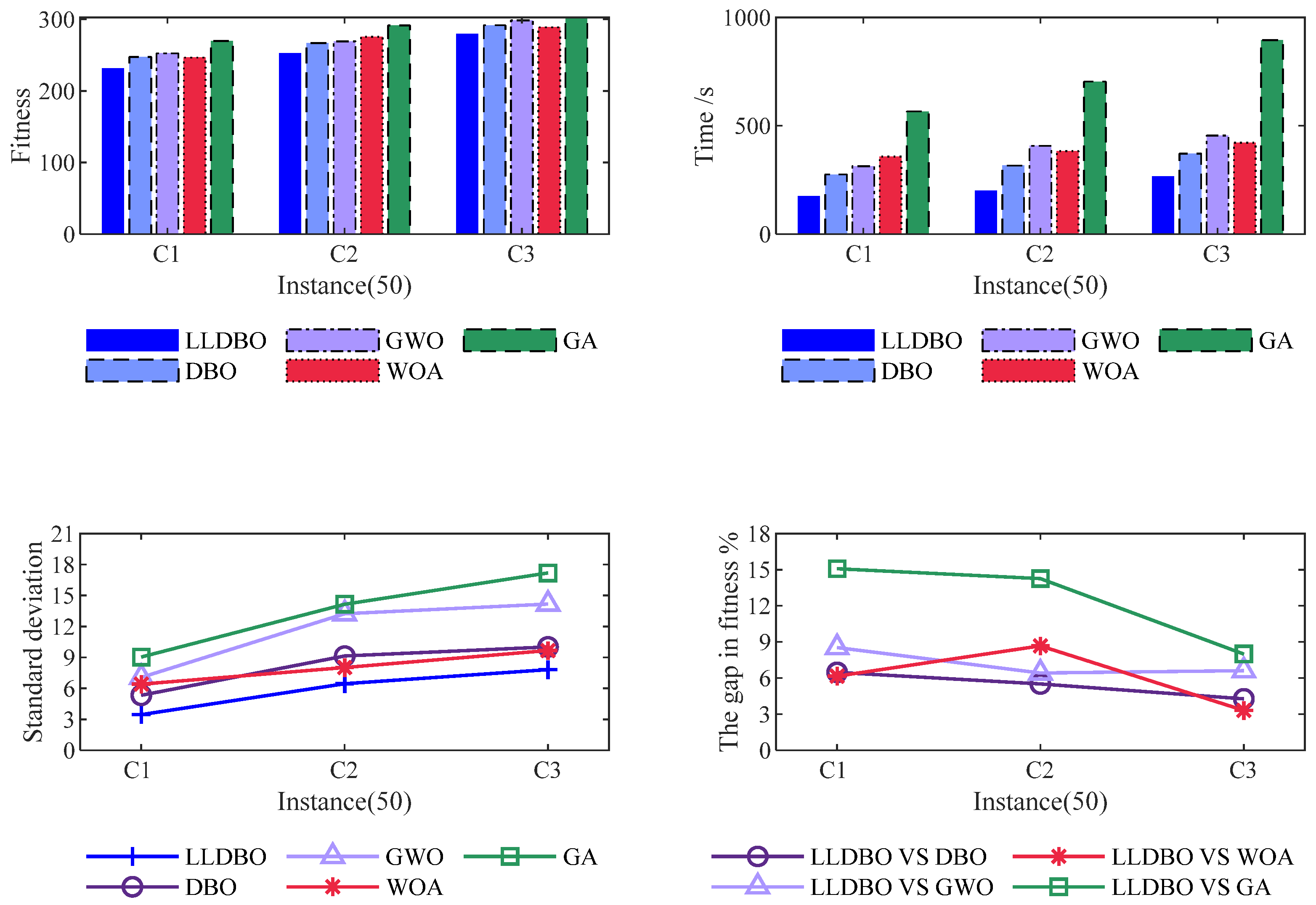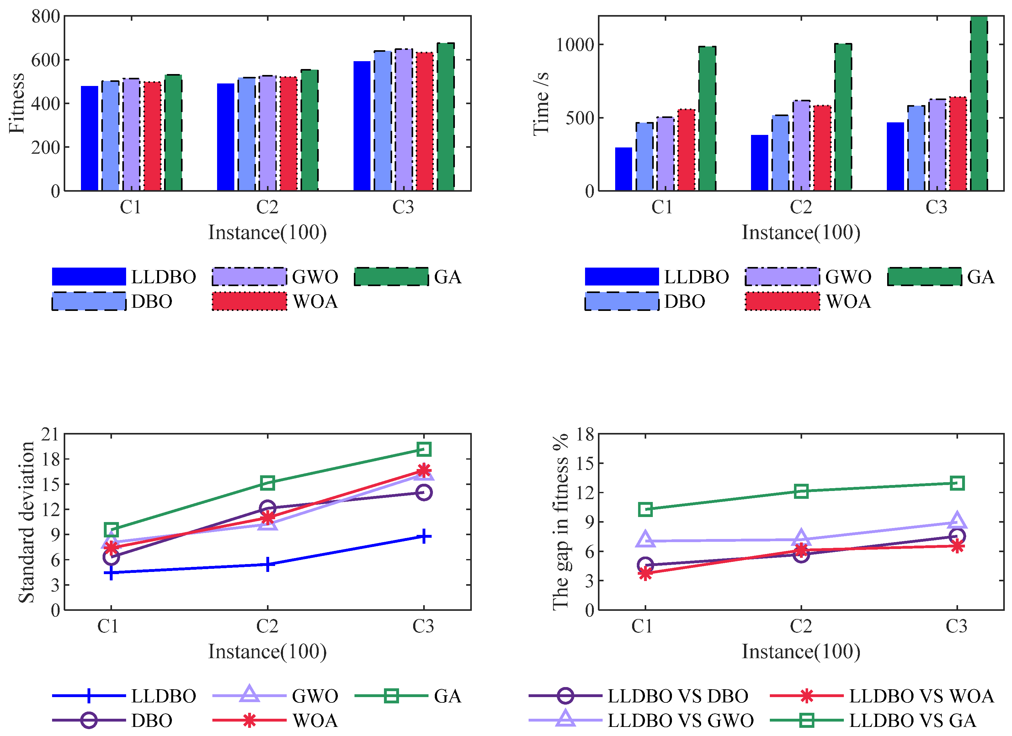 The superior performance of LLDBO can be attributed to its effective balance between exploration and exploitation, achieved through the integration of chaotic initialization and dynamic population allocation mechanisms. These features enable the algorithm to effectively navigate complex solution spaces while avoiding premature convergence, making it particularly suitable for large-scale delivery optimization problems.
