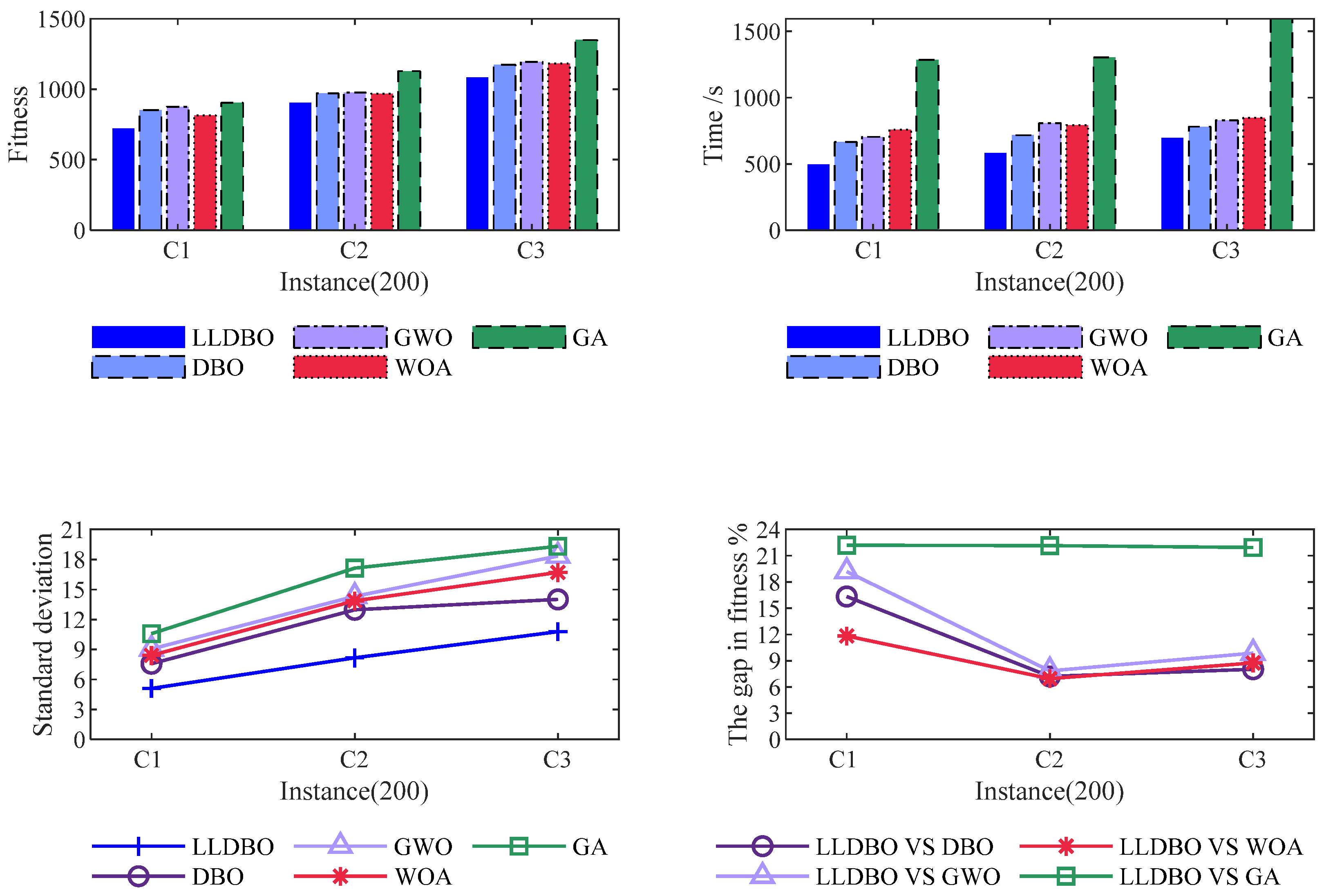 In order to verify the effectiveness of the Improved Dung Beetle Algorithm (LLDBO), the experimental instances of 25 customer points, 50 customer points, 100 customer points, and 200 customer points are each run with the Improved Dung Beetle Algorithm (LLDBO), the CPLEX Exact Algorithm (CPLEX), the Conventional Dung Beetle Algorithm (DBO), the Grey Wolf Algorithm (GWO), the Whale Optimization Algorithm (WOA), and the Genetic Algorithm (GA), respectively. Run 200 times, each of the four sizes of experimental instances has three improved Solomon datasets. The comprehensive performance comparison of all algorithms for the 200-customer scenario is detailed in