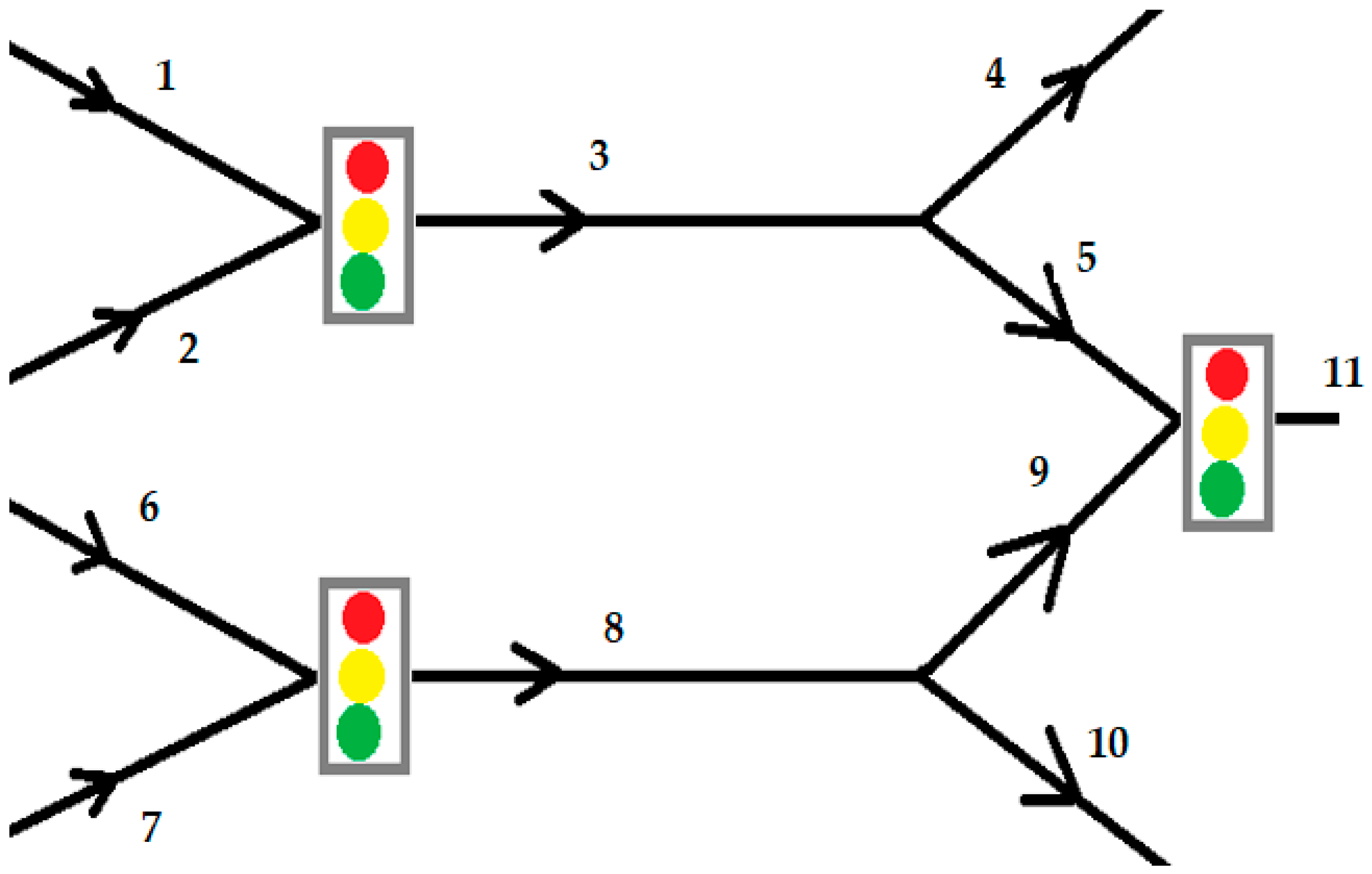 The traffic network under consideration comprises eleven links, each structured as a one-lane, one-way street to facilitate a simplified model. The traffic simulation used has four entry routes (identified by traffic flows marked 1, 2, 6, and 7) and three exit routes (identified by traffic flows marked 4, 10, and 11). At the junctions, when the traffic lights are green, vehicles in the queue flow, and 3 and 8 leave the traffic through the exit routes.