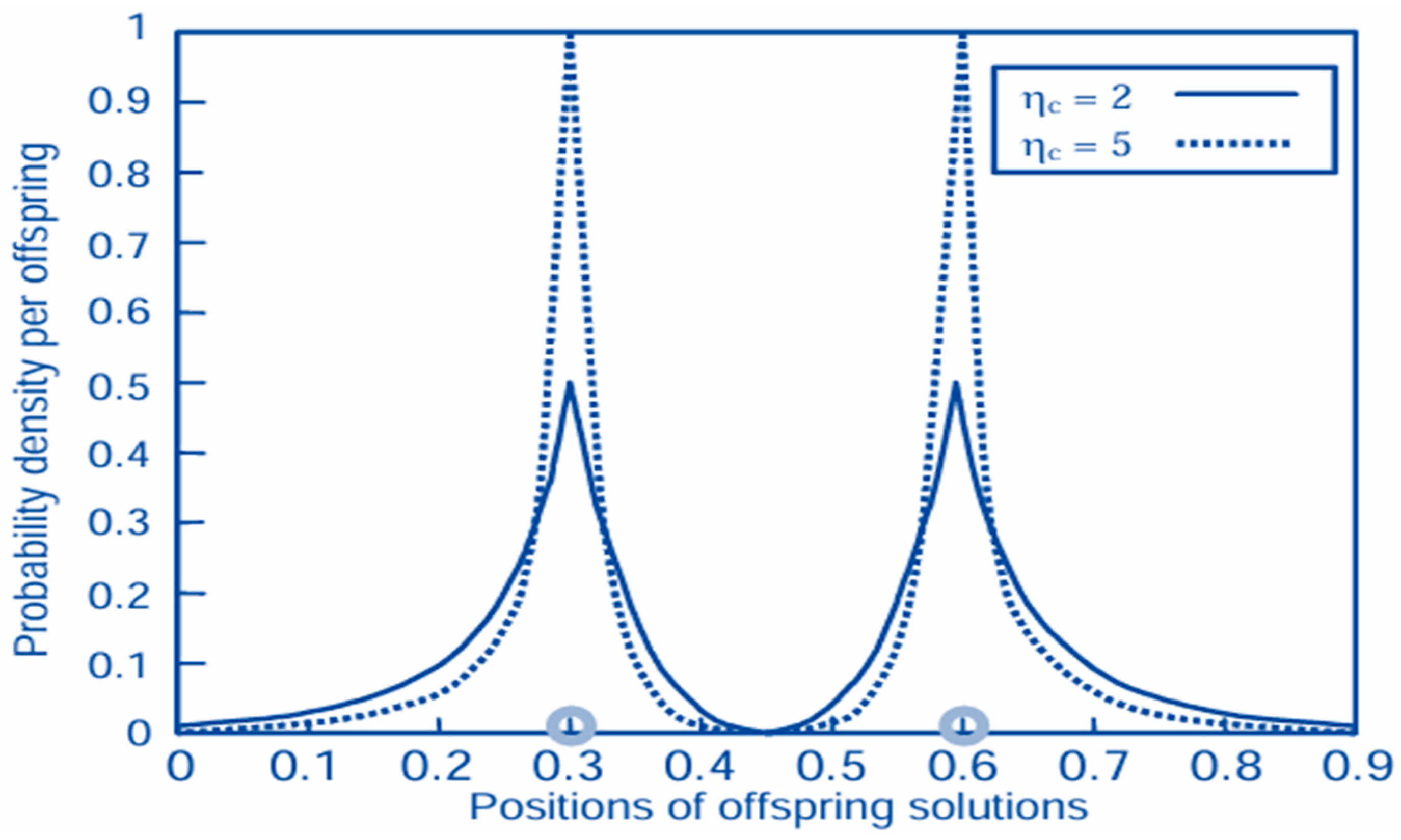 From GA, the Estimated Time of Arrival (ETA) value, or (ηc), in simulated binary crossover (SBX) controls the spread of offspring around their parents, with a greater value of η producing offspring closer to their parents and a smaller value allowing for more distant solutions to be selected, as shown in