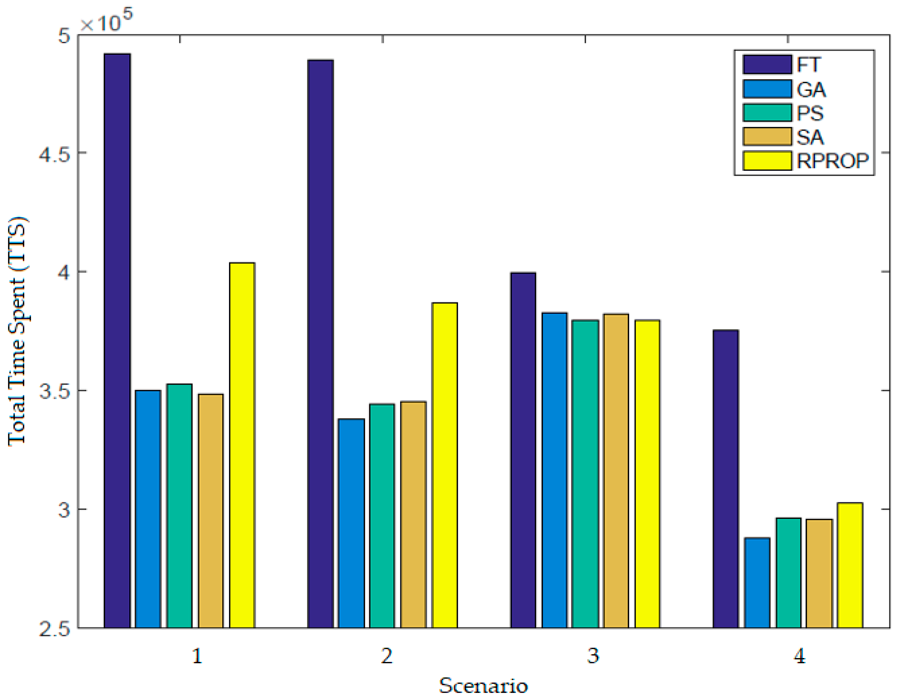 Figure 10 presents the comparative results for the four proposed traffic scenarios using the optimization algorithms (GA, FT, PS, RPROP, and SA), reported as total time spent (TTS), a key metric in traffic flow theory and intelligent transport systems (ITSs) that measures vehicle delay and congestion. In the four scenarios proposed in the article and used for comparison, the GA had the best results in terms of reducing TTS in the intersection.