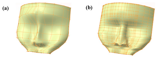 - Piegl, L.A.; Tiller, W. Reducing control points in surface interpolation. IEEE Comput. Graph. Appl. 2000, 20, 70–75. [Google Scholar] [CrossRef]