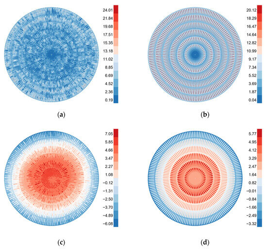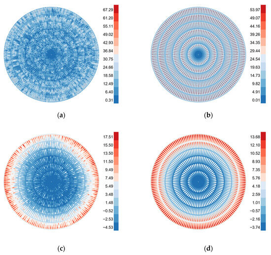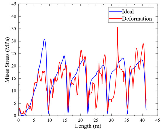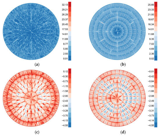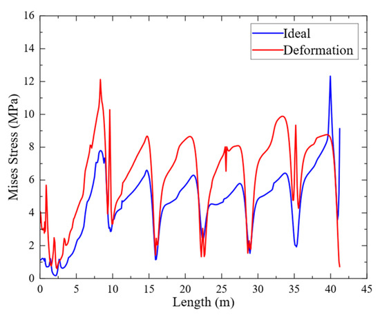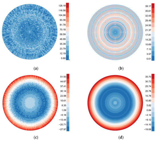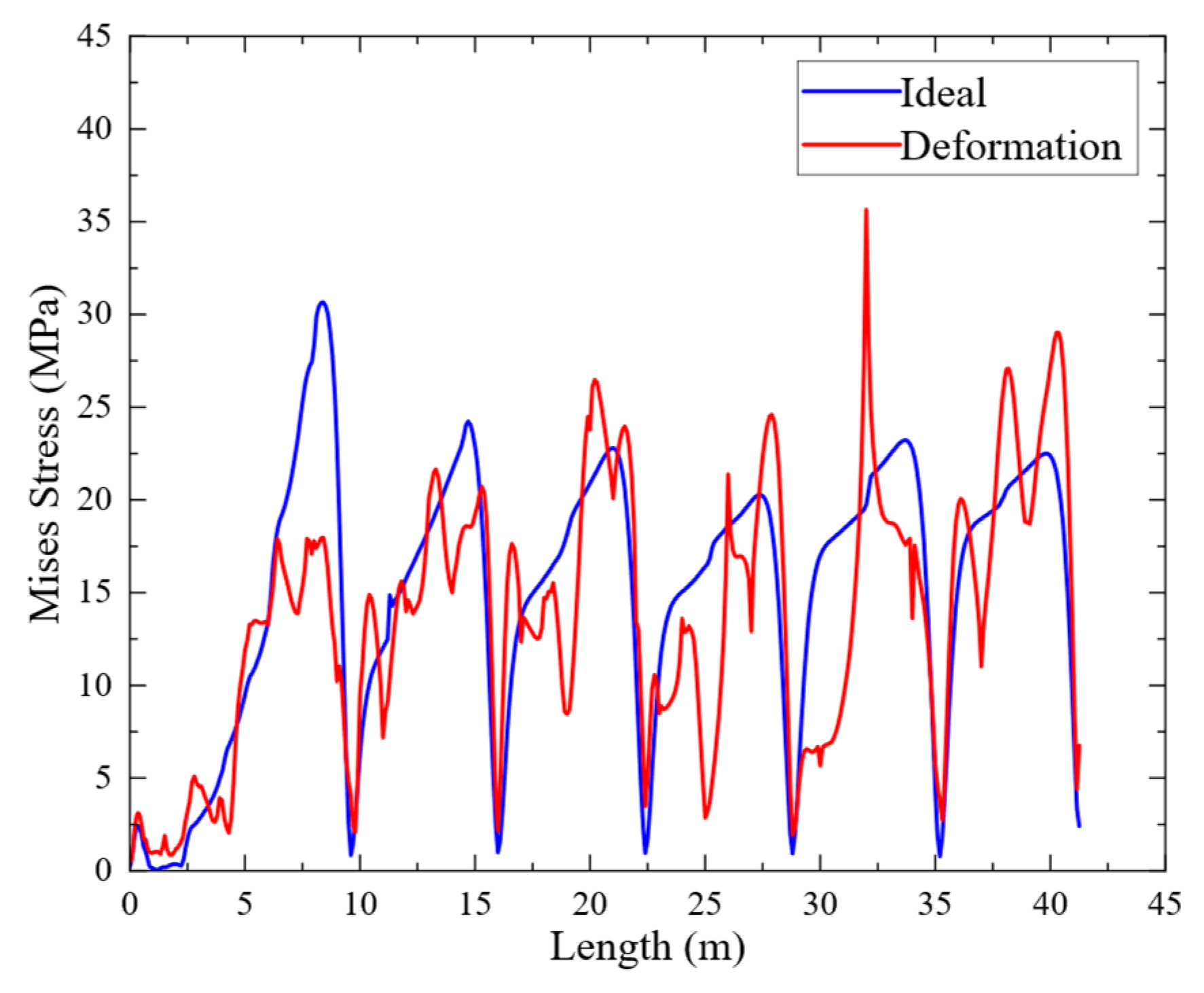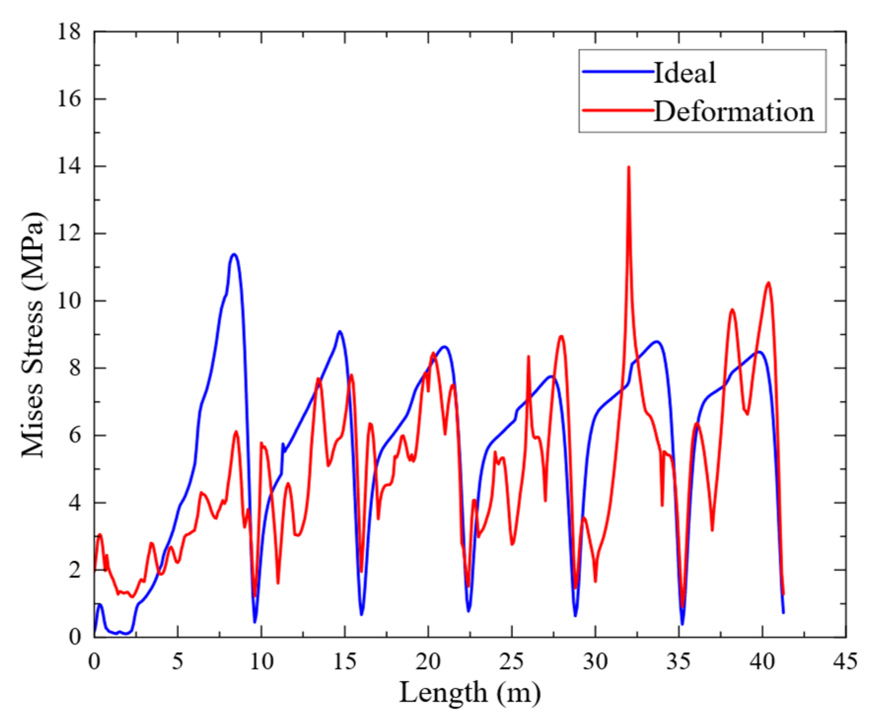 - Under the extreme non-uniform rainfall condition, the measured initial geometric deformation of the floating roof bottom plate significantly amplified the structural response, leading to a substantial increase in stress in the central region and the emergence of multiple localized high-stress areas. Compared with the ideal model, the deformed model exhibits more pronounced radial equivalent stress fluctuations, making it more susceptible to large deformations and localized warping under uneven loading.