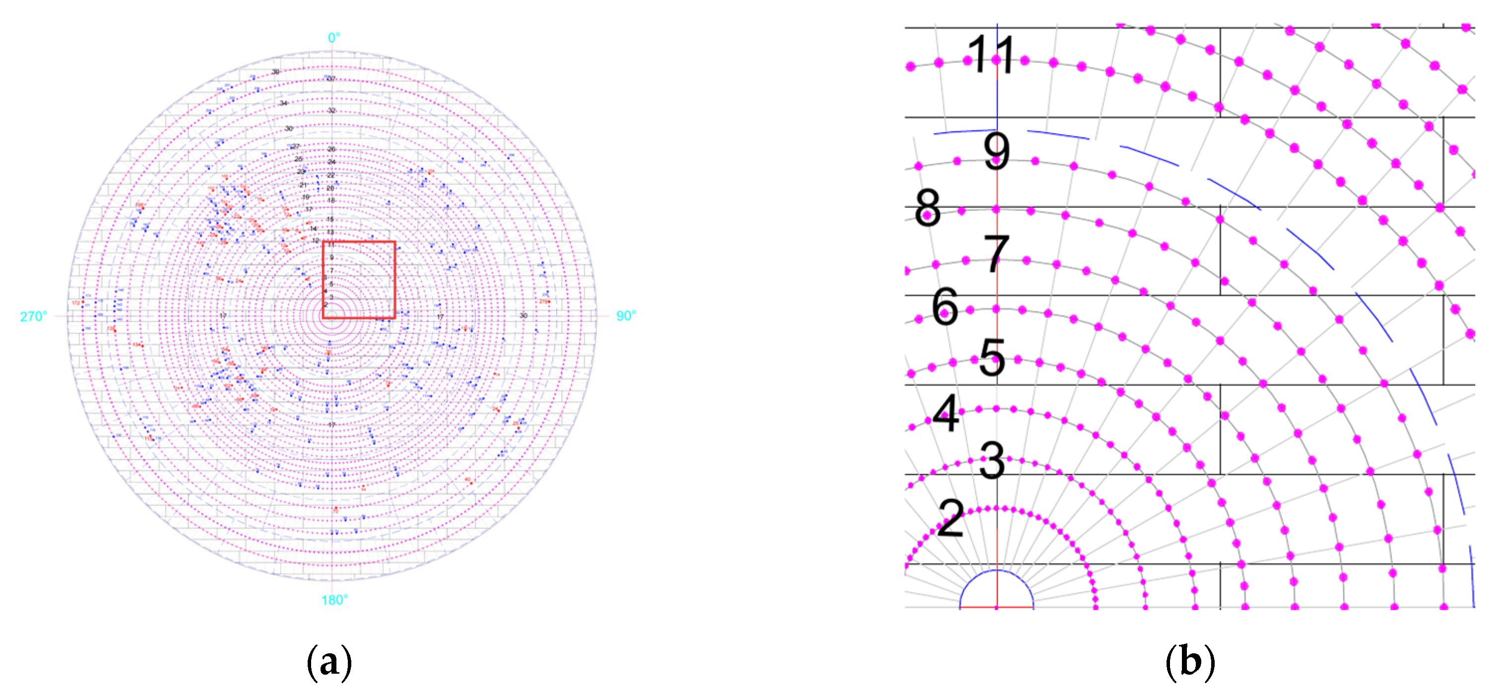 | Ring Area Number | Radius Range [m] | Number of Measuring Lines | Number of Measuring Points on the Measuring Line | Total Number of Regional Measuring Points |