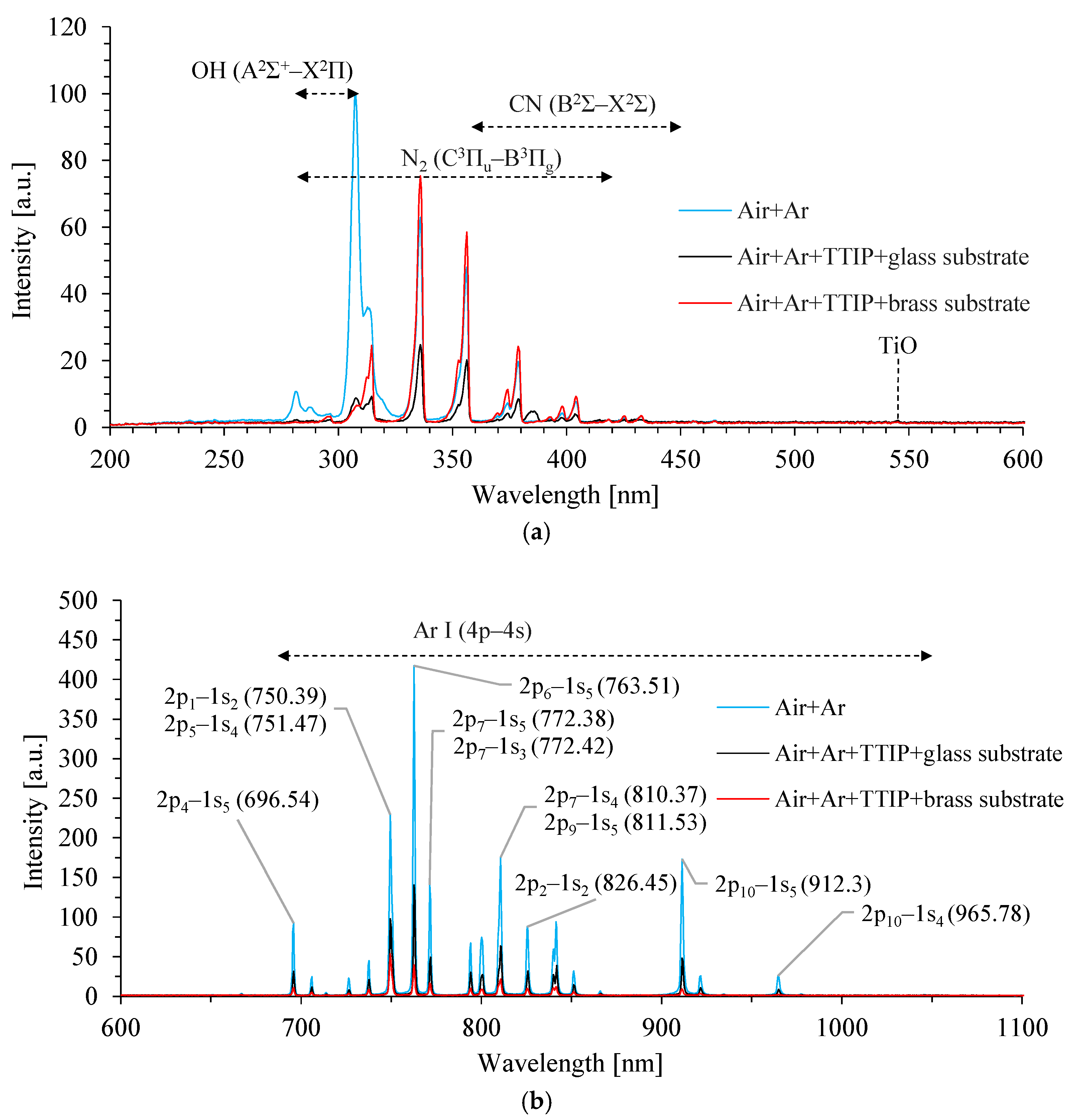 - Gazal, Y.; Chazelas, C.; Dublanche-Tixier, C.; Tristant, P. Contribution of Optical Emission Spectroscopy Measurements to the Understanding of TiO2 Growth by Chemical Vapor Deposition Using an Atmospheric-Pressure Plasma Torch. J. Appl. Phys. 2017, 121, 123301. [Google Scholar] [CrossRef]