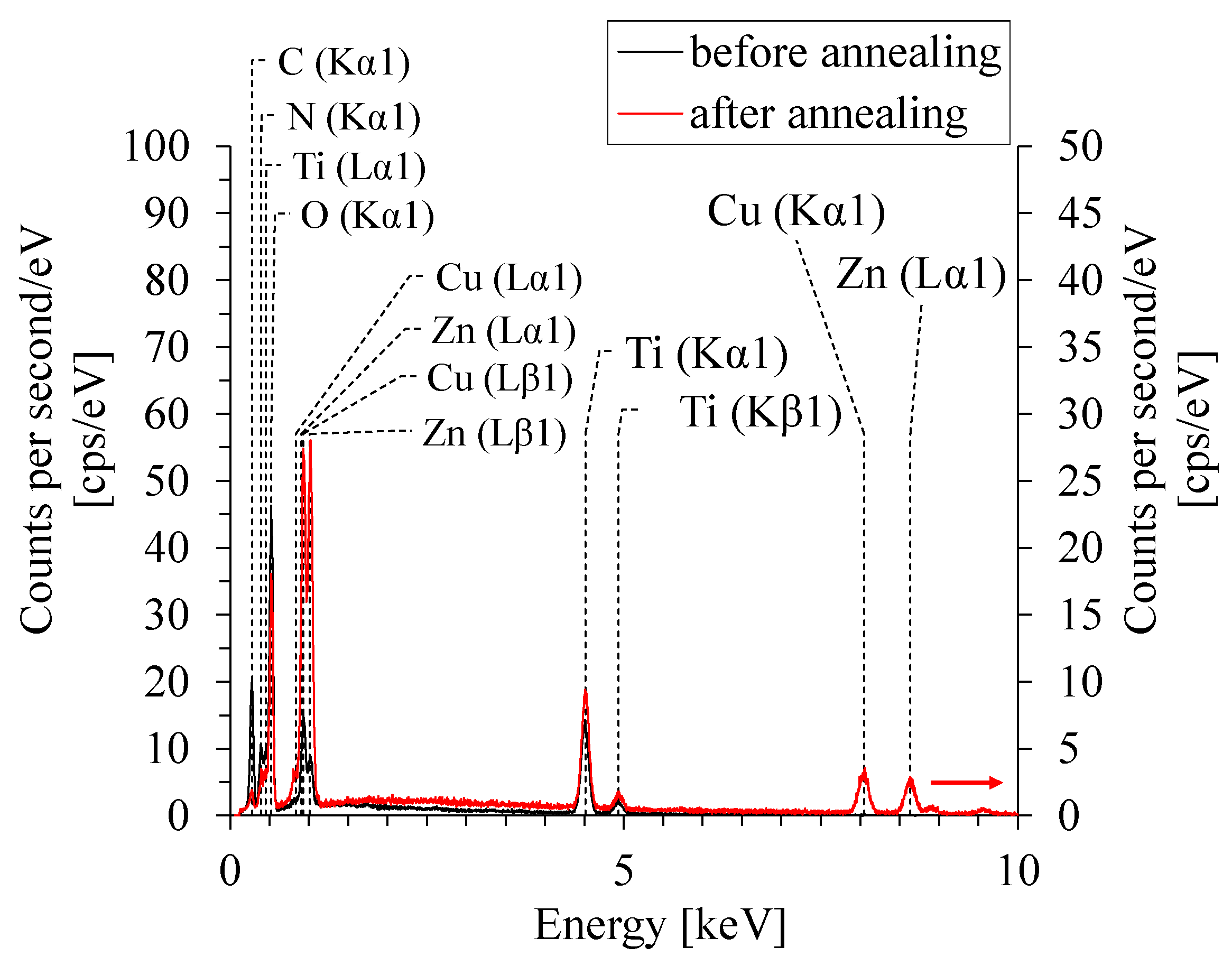 Layer deposited on brass substrate in DBD | Element | Before annealing [norm. wt.%] | After annealing [norm. wt.%] |