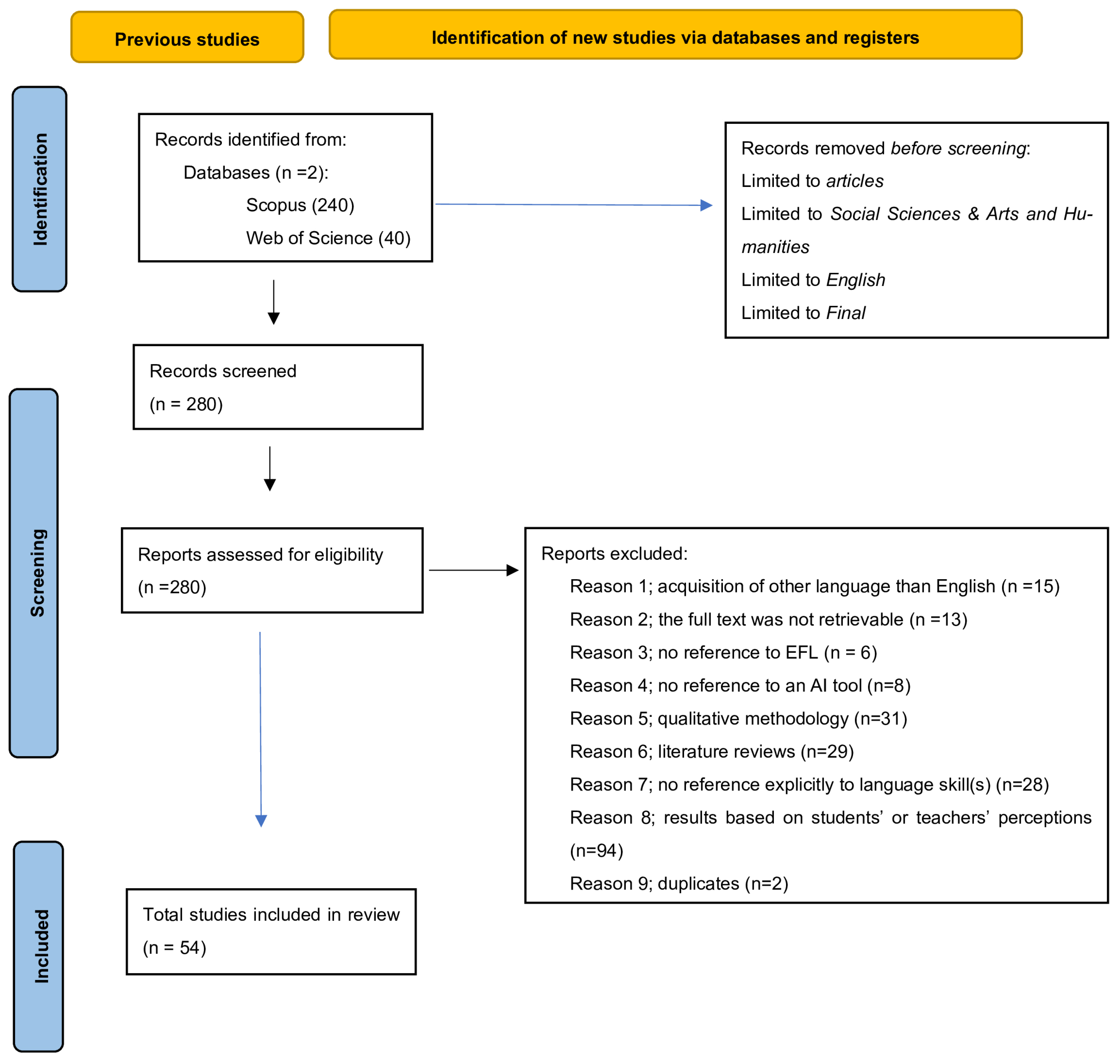 - Studies that examined relevant topics in accordance with students’ or teachers’ views and perceptions. We deliberately excluded studies that based their results solely on students’ or teachers’ perceptions, as we primarily wanted to focus on empirical outcomes. Thus, we intended to focus on the measured effects on writing and speaking skills, as well as documented challenges and limitations, within empirical contexts.