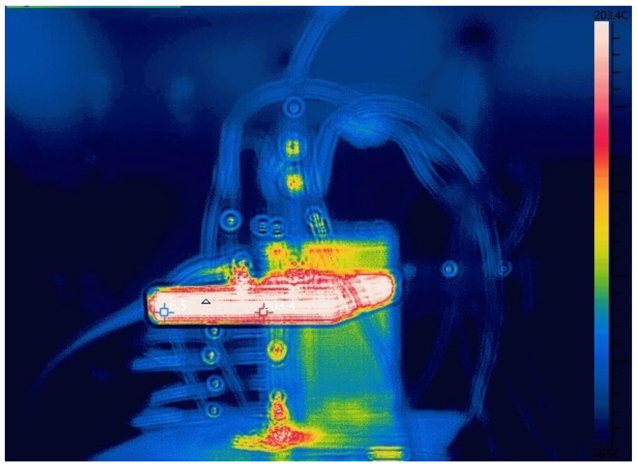 In the first phase, melting initiates preferentially in the central region due to heat dissipation from the peripheral surfaces of the tin block to the surrounding air. Consequently, the temperature of the heater assembly decreases as heat is absorbed by the melting process. Since the outer regions of the tin block remain solid and continue to provide support, the heater maintains its position, and a small molten pool gradually forms at the contact interface.
