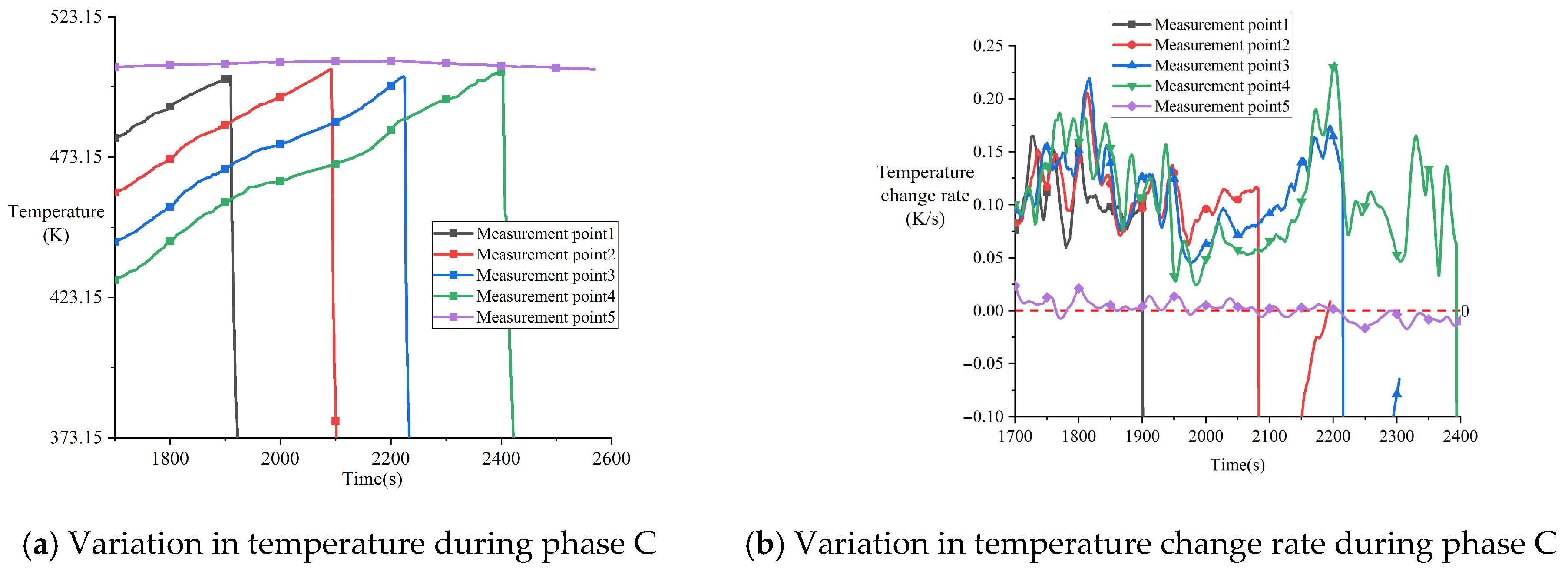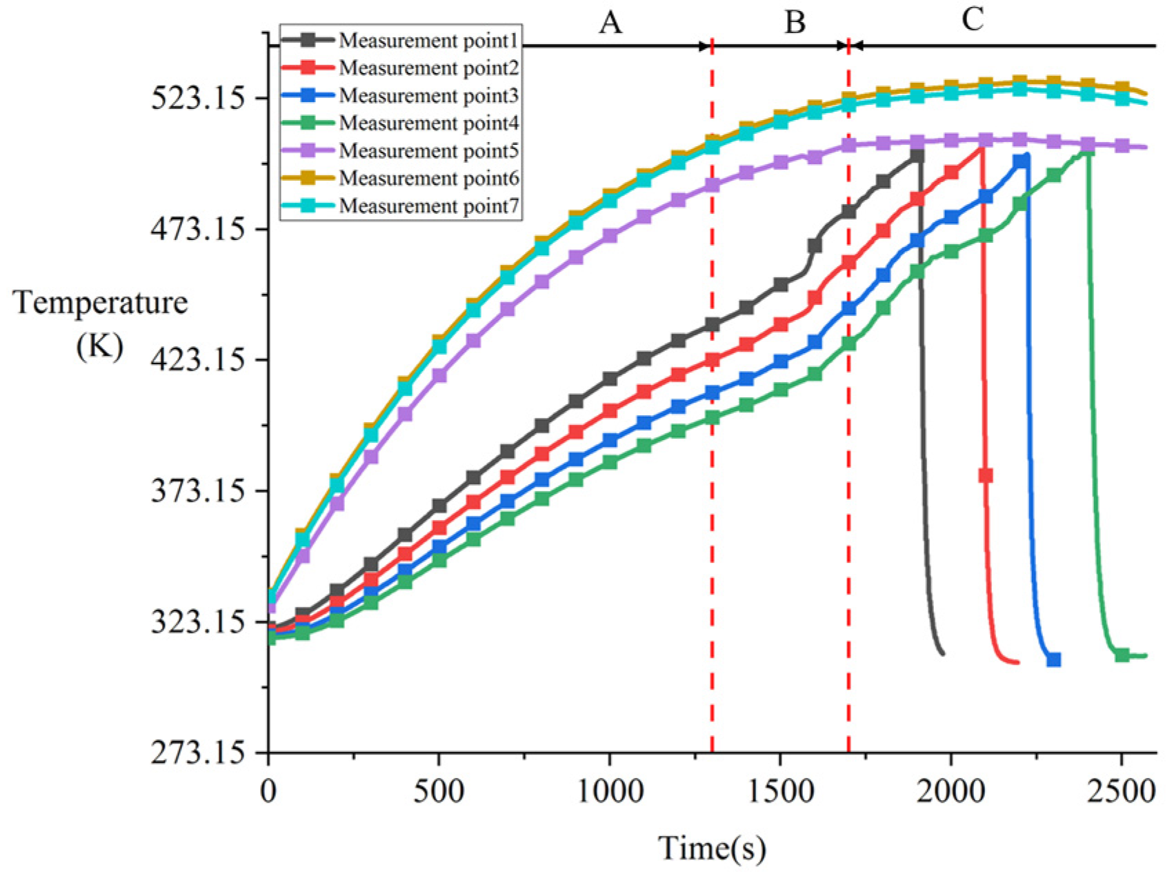 Due to the extended duration of the experiment and significant temperature increase, certain details in the overall temperature variation curve are difficult to distinguish. To more clearly analyze the temperature response characteristics and their physical mechanisms at different stages, this study divides the temperature variation process into three phases: Phase A, where all measurement points began to heat up under the heating power and the temperature change rate gradually decreased due to enhanced convective heat transfer with the surrounding environment (corresponding to 0–1300 s in