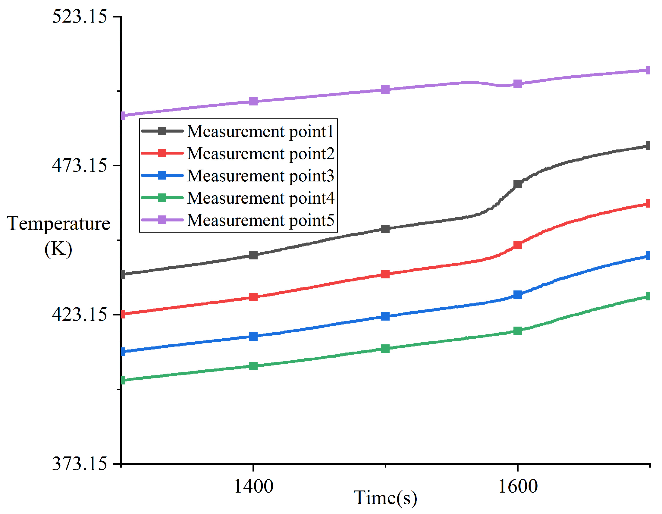 Figure 8). During the continuous heating process, the temperature at measurement point 5 exhibited an anomalous decrease at 1563 s, which persisted until 1588 s. The temperature dropped from 501 K to 500 K. During this period, a significantly increased temperature change rate can be clearly observed in the melting block in