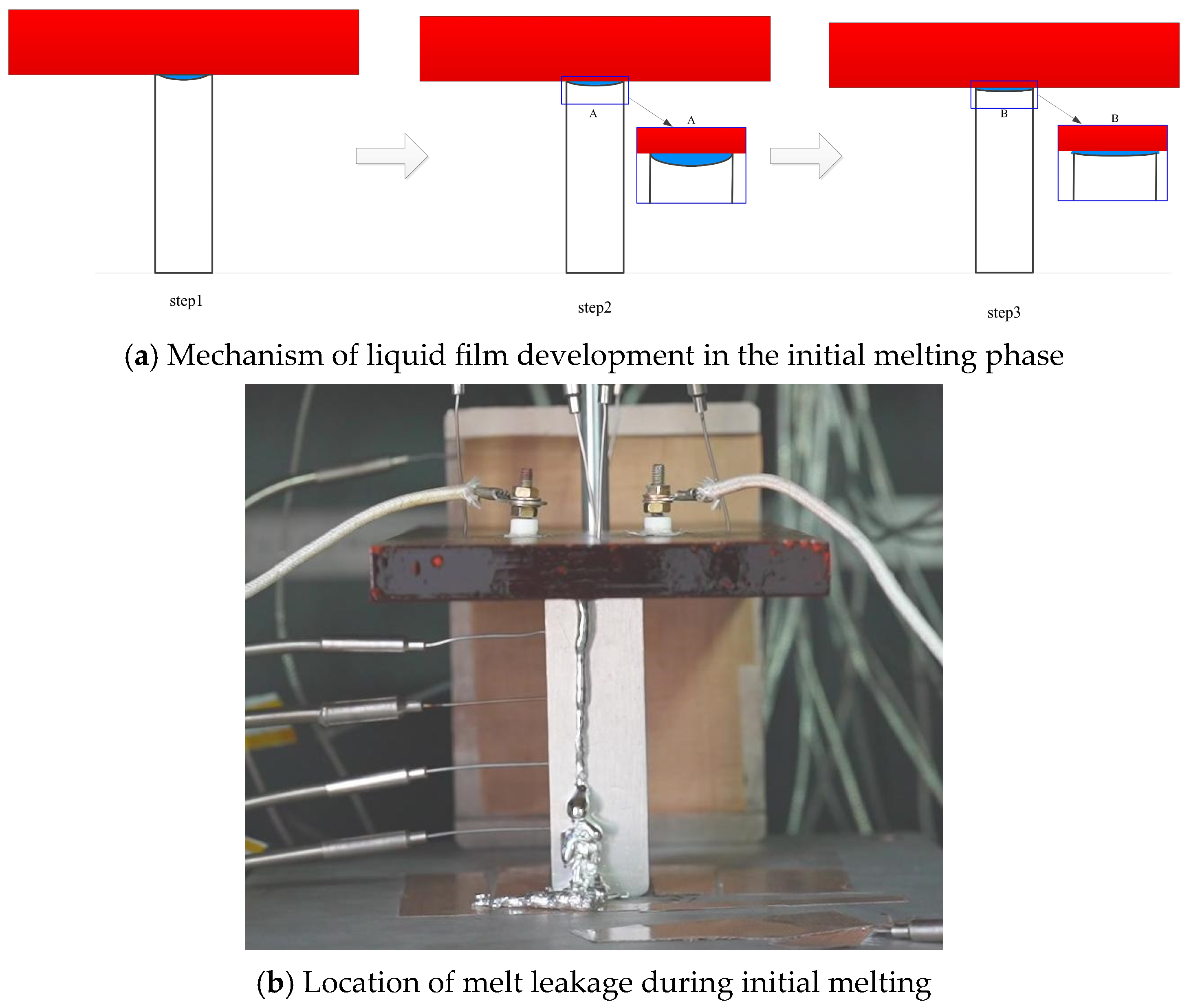 Figure 15, a schematic diagram illustrates the melt migration during the initial melting phase. Neglecting the non-uniformity of thermal resistance at the contact surface, the development of the liquid film in the early melting stage can be divided into three phases (