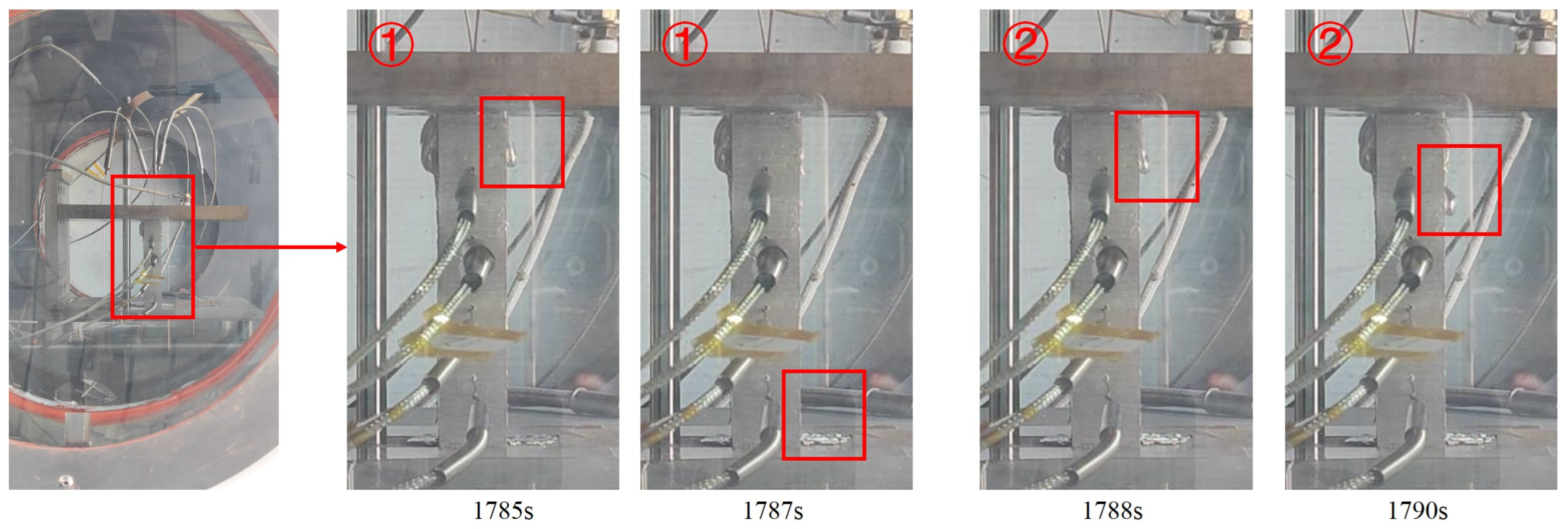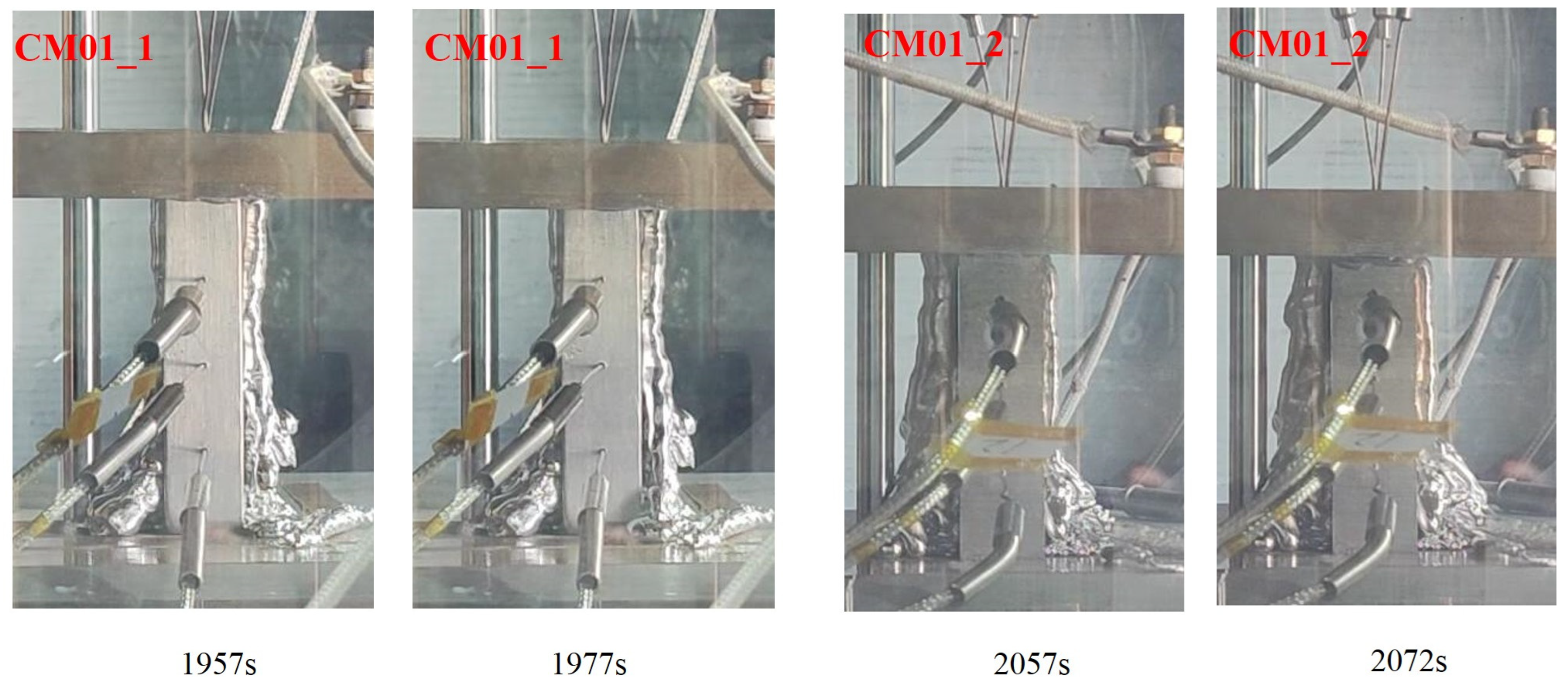 After the liquid film between the contact surfaces became fully developed, the molten material began to flow out of the contact melting zone along the short-edge direction—following the spreading direction of the liquid film—and moved downward along the wall of the melting assembly. Part of the melt wetted the surrounding wall surfaces, while the rest continued to migrate downward. As the temperature decreased due to heat exchange with the environment, the migrating melt accumulated and solidified on the wall, forming a solidified layer. Subsequently, newly generated molten material, upon reaching the mid-lower part of the assembly, partially detached from the wall in fragment form during solidification, as shown in
