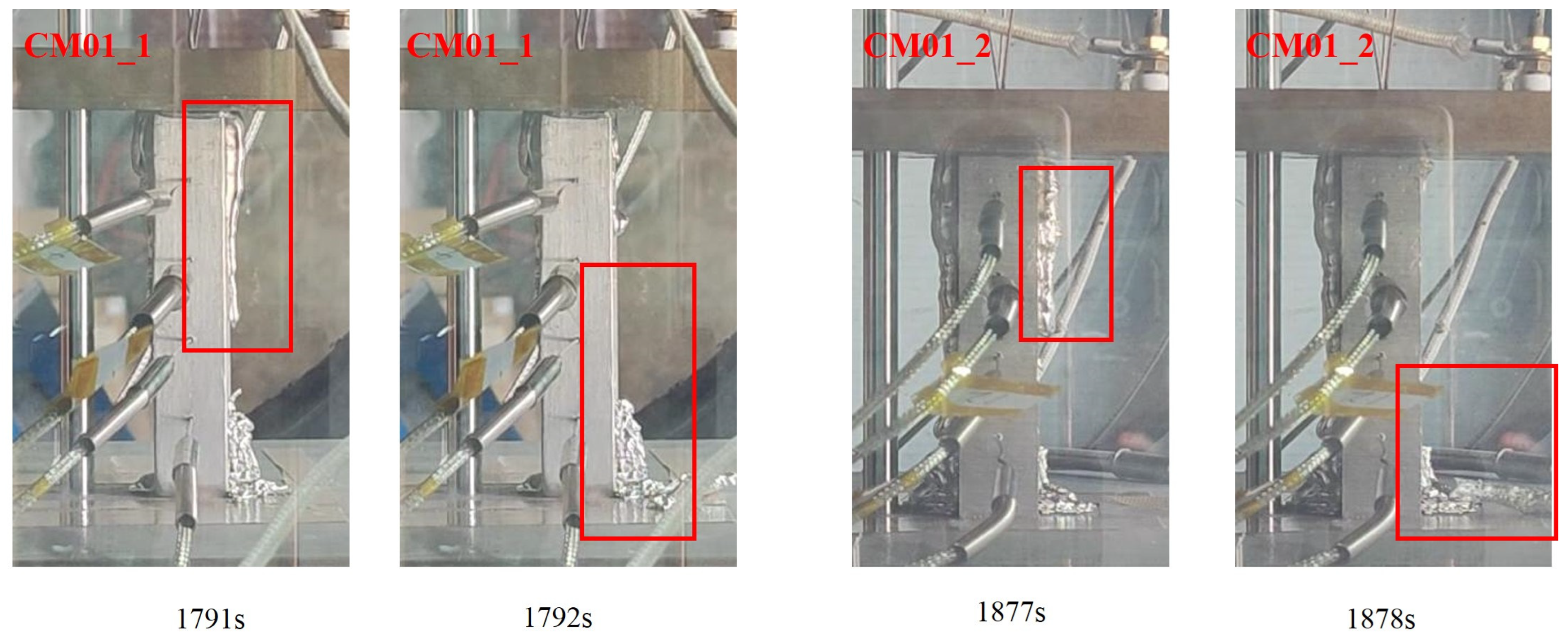 Figure 17 shows continuous candle dripping during melting in experiment CM01, with two instances marked as ① (CM01_1) and ② (CM01_2). Comparison with