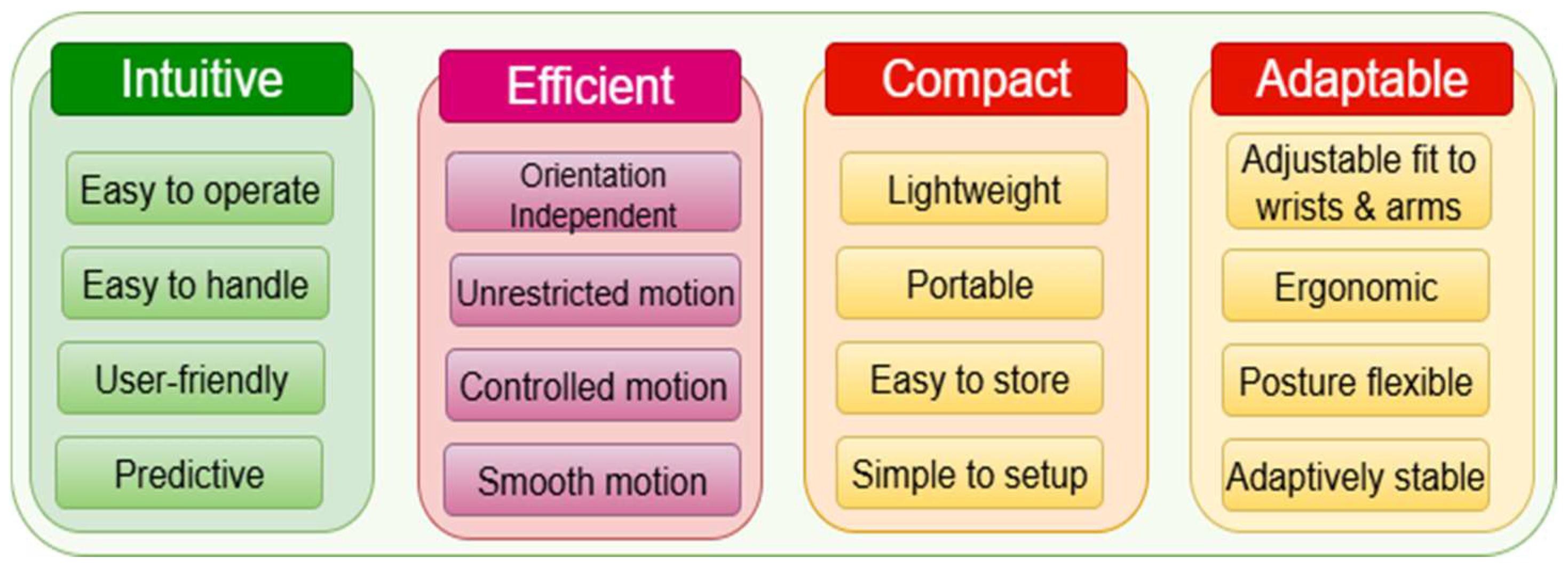 - Efficient: Capable of delivering adequate mechanical assistance without unnecessary complexity, and capable of smooth well-controlled motion independent of the orientation of the body.