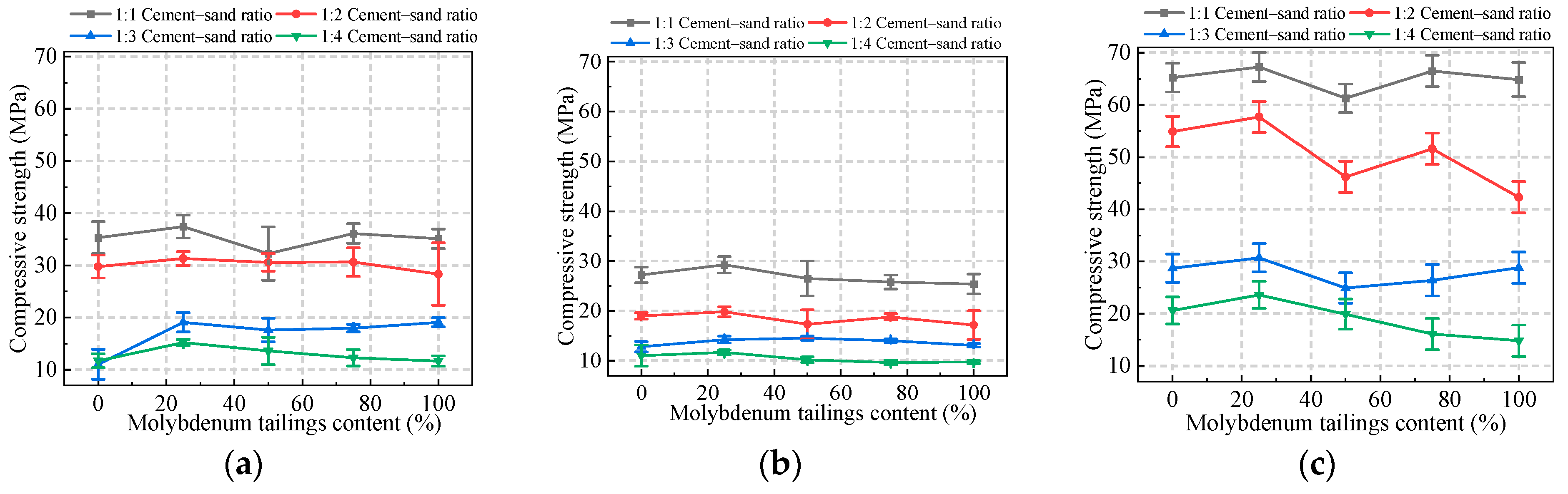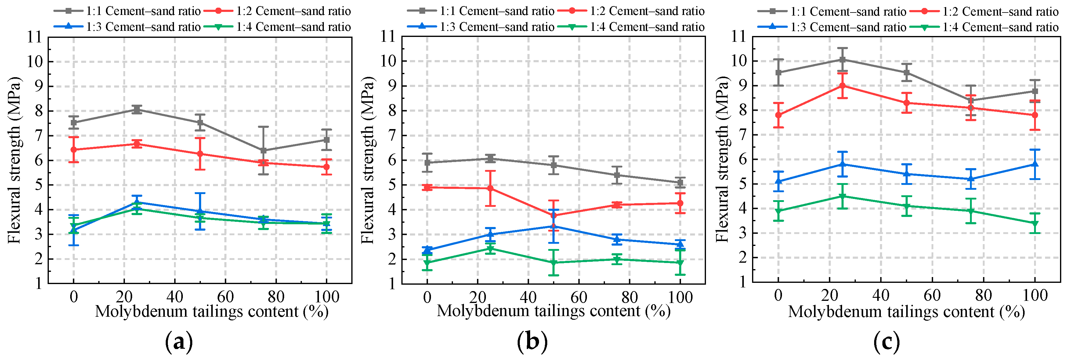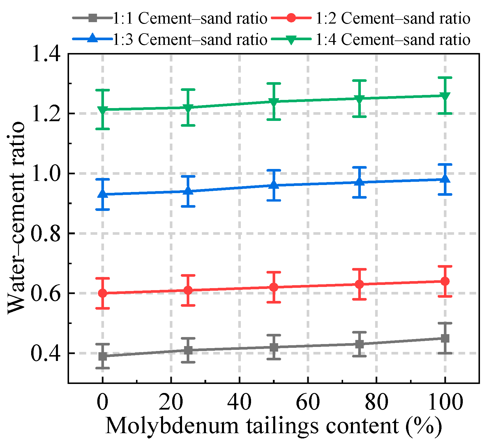 3.1.1. Effect of Different Cement-to-Sand Ratios and Molybdenum Tailings Content on the Water–Cement Ratio