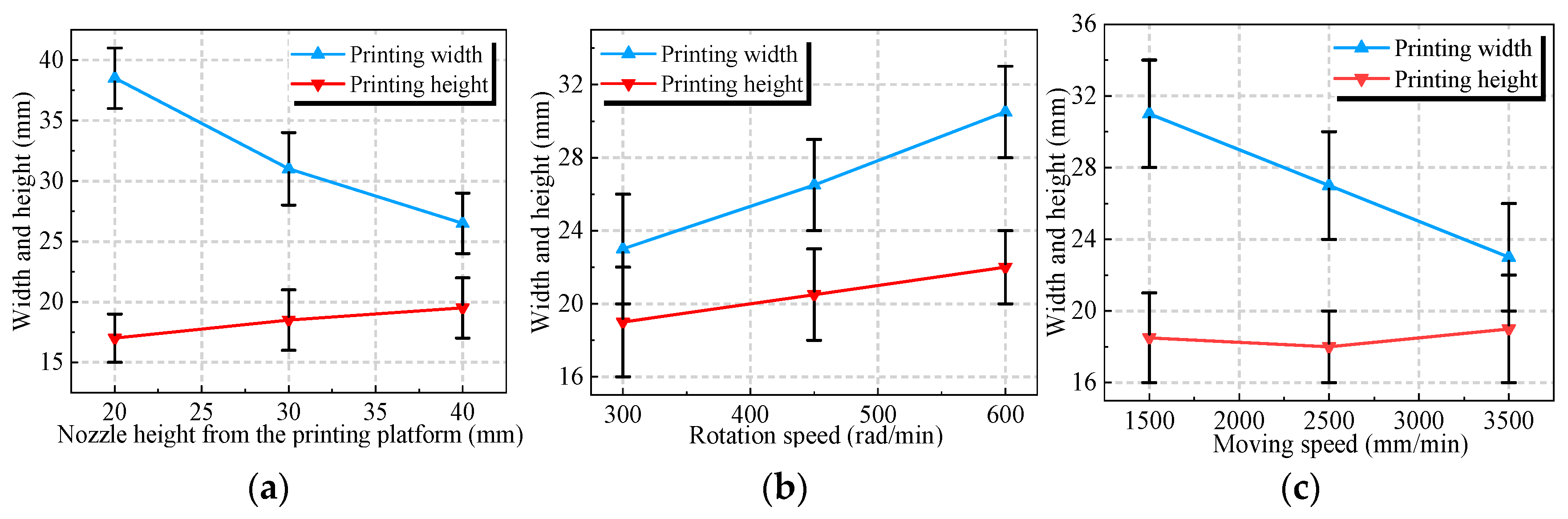 - The study of rheological properties indicates that mortar with a cement-to-sand ratio of 1:1 to 1:2 exhibits good printability, while mortar with ratios of 1:3 and 1:4 shows poor printing results. Under fixed nozzle diameter, movement speed, and rotation speed, increasing the nozzle height above the print bed leads to a decrease in print width, with little effect on print height. When the nozzle rotation speed increases, both the print width and height increase significantly; however, an increase in nozzle movement speed results in a decrease in print width, with limited impact on height.