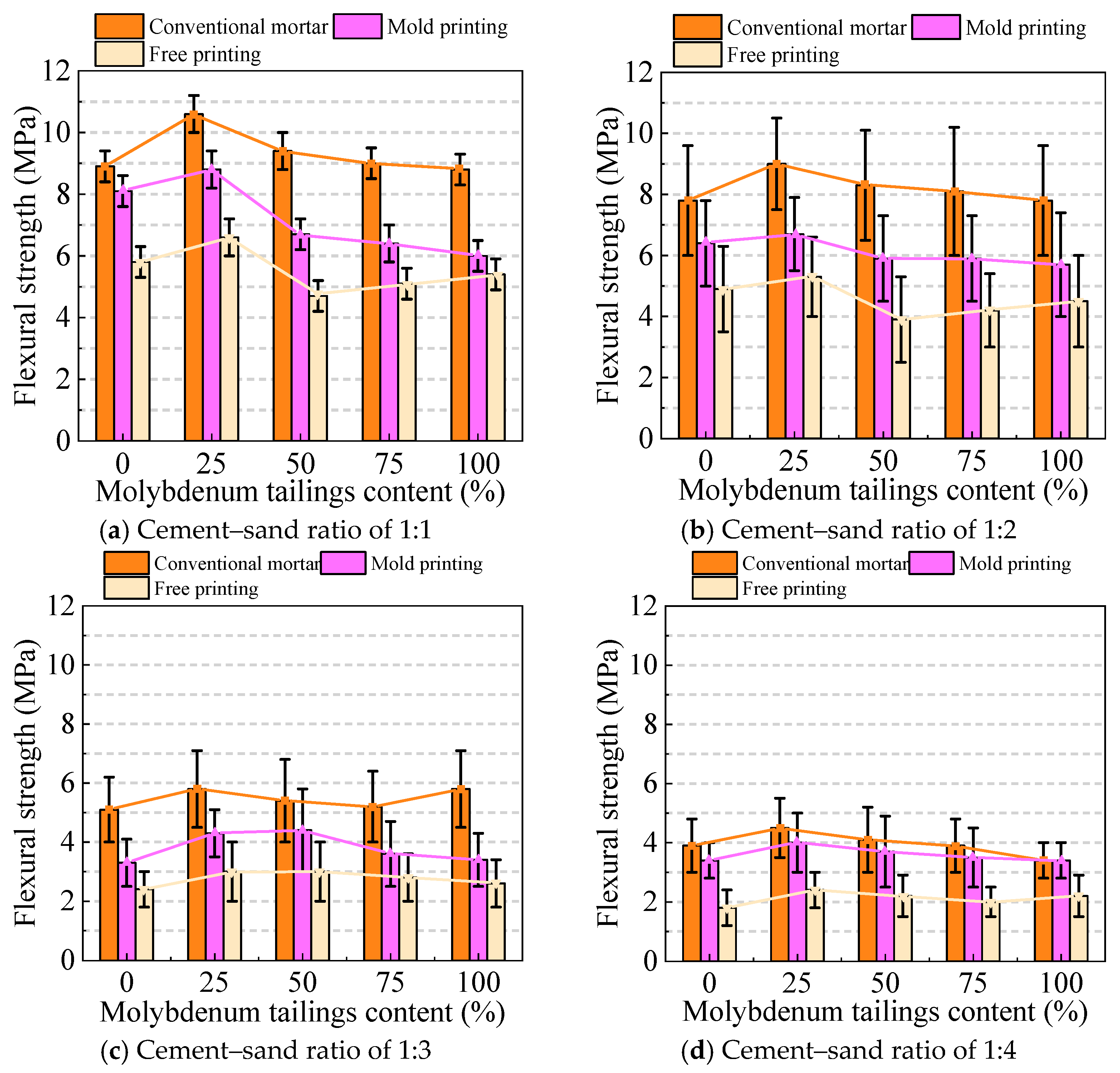 - The mechanical performance test results show that the flexural strength of conventional mortar is superior to that of mold-printed mortar, which in turn is higher than that of free-printed mortar, with strengths ranging from 70% to 80% and 45% to 60%, respectively, compared to conventional mortar. The compressive strength exhibits a similar pattern, with mold-printed and free-printed mortars showing strengths of 55% to 75% and 35% to 55%, respectively, compared to conventional mortar. Increasing molybdenum tailings content leads to a decrease in both flexural and compressive strength, but the variation in cement-to-sand ratio has a more significant impact on strength.