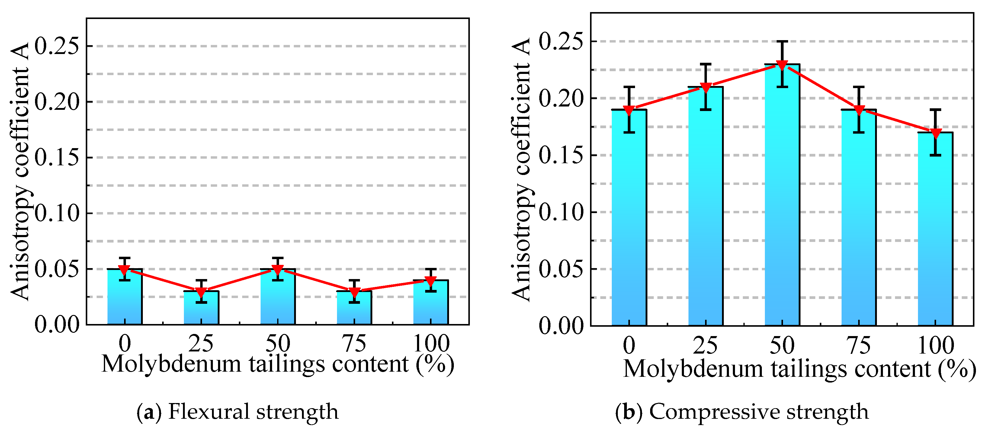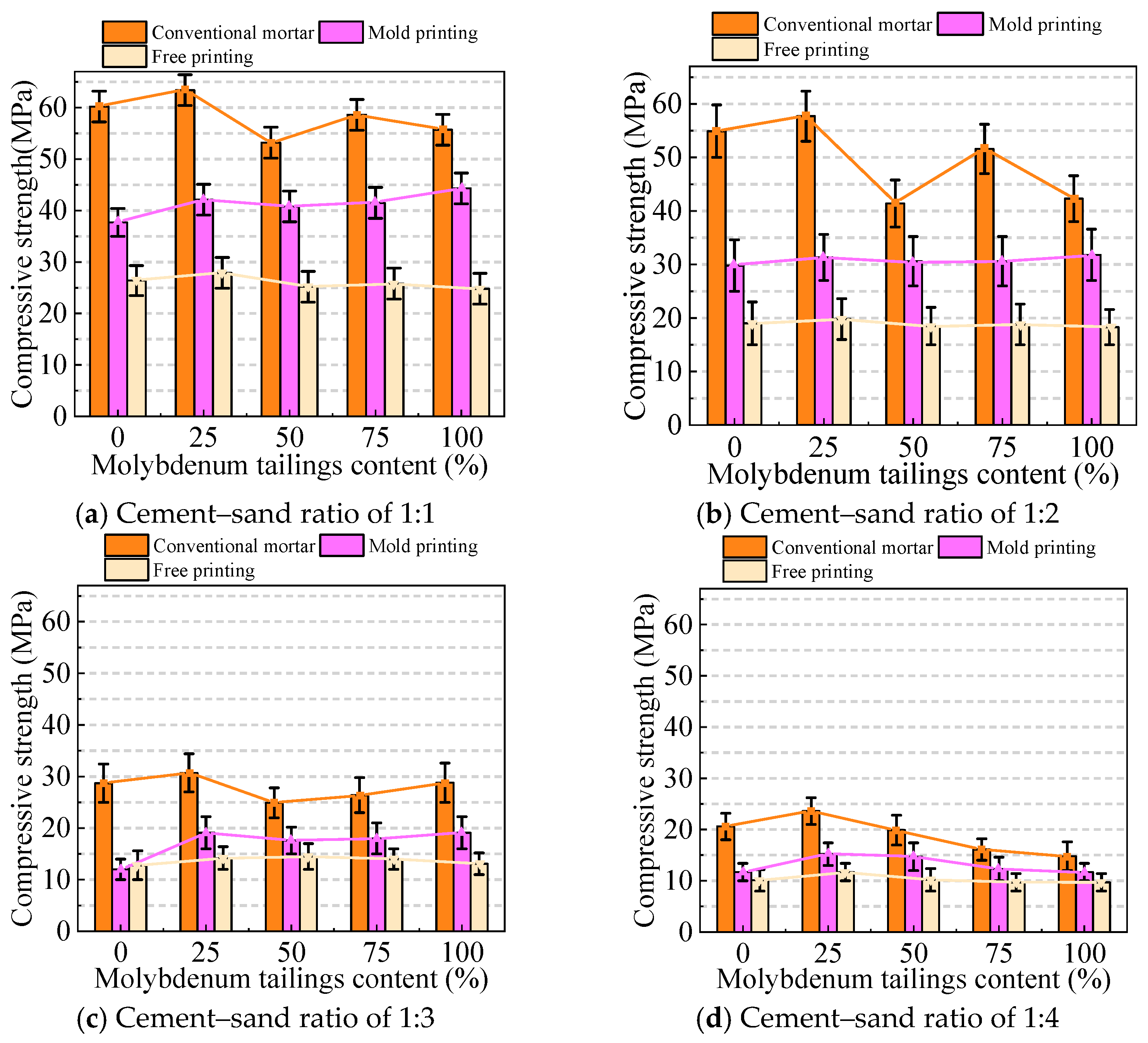 3.2.1. Experimental Analysis of the Mechanical Properties of 3D-Printed Molybdenum Tailings Mortar