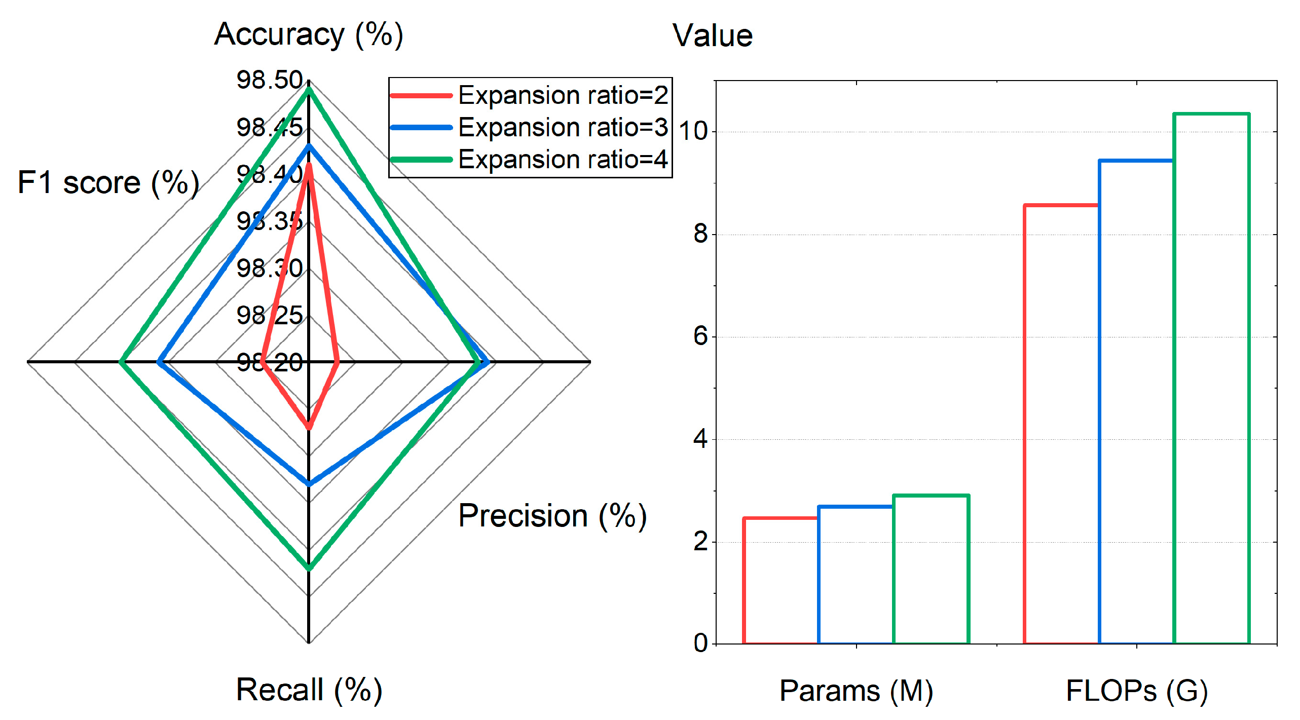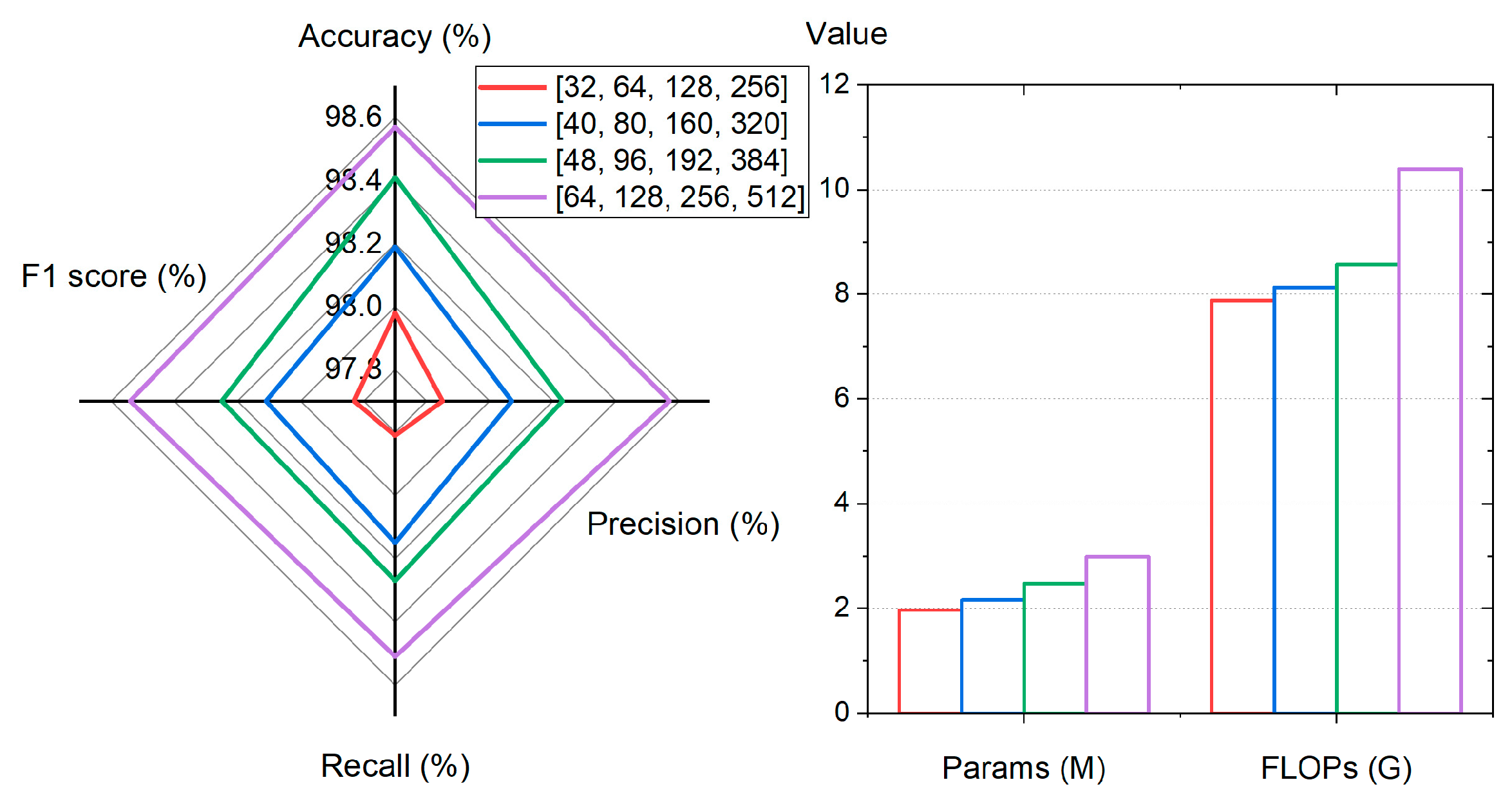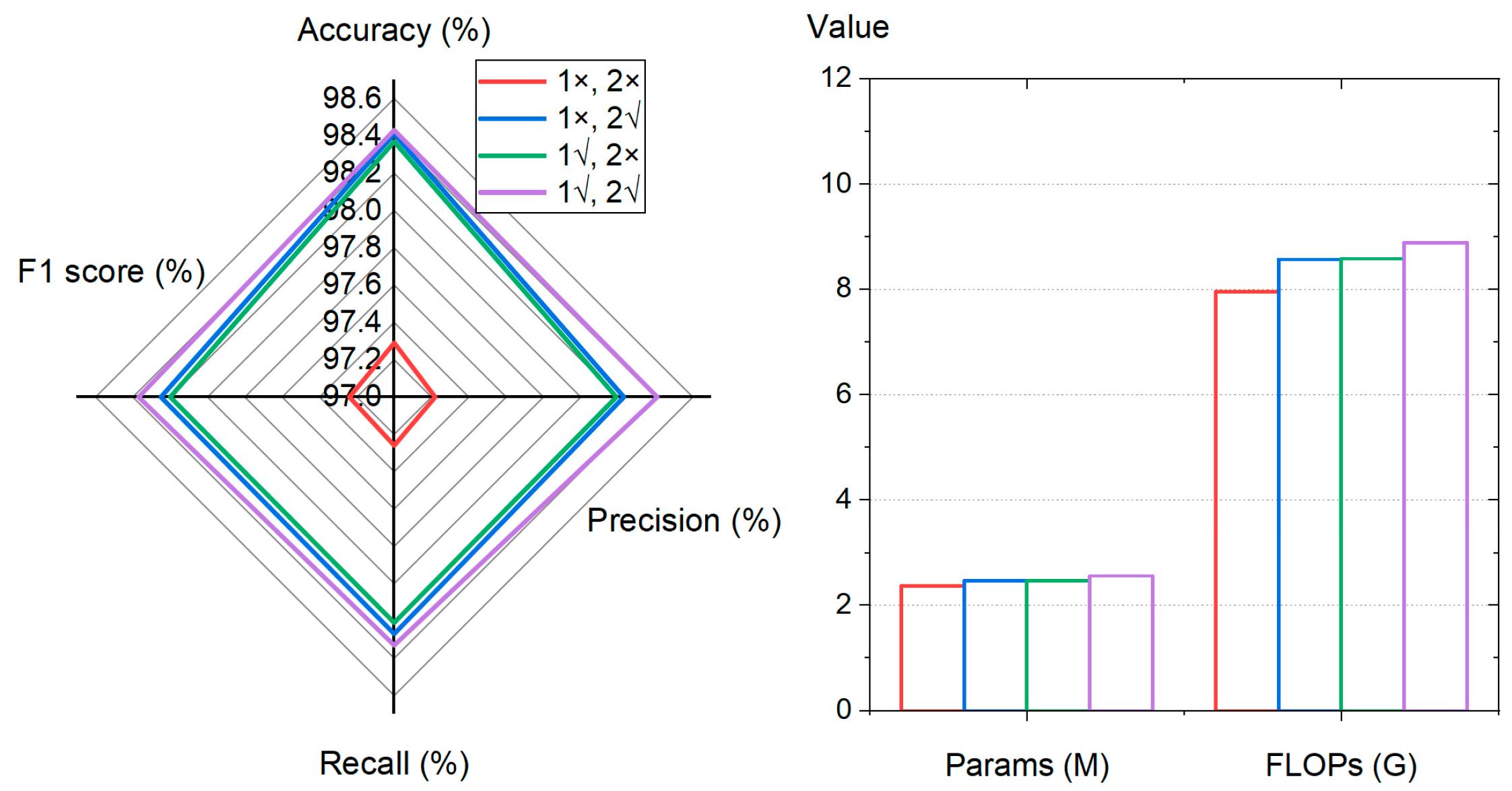 - In terms of classification performance, traditional CNN models have relatively low performance, with four indicators accounting for about 85%. MobileNetV3 performs stably, with all indicators reaching over 97%; Uniformer is relatively good, with all four indicators exceeding 98%. Among all models, the LT model performed the best, with significantly higher accuracy (99.06%), precision (99.17%), recall (98.87%), and F1 score (99.02%) compared to other models.