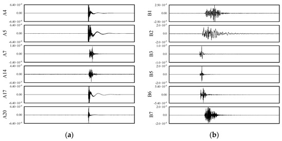 Given the strong correlation between energy and precise positioning results, and recognizing that the accuracy of positioning primarily hinges on the accurate picking of P-wave first arrival times, a comparative analysis of the P-wave first arrival time picking results from blasting waveforms recorded by both systems became essential. During the blasting events, no valid waveforms were observed from the A1 sensor of the System A microseismic monitoring system and the B4 sensor of the System B microseismic monitoring system, as these channels were not functioning properly. Consequently, as illustrated in Figure 3a,b, the effective number of operational channels for both systems was reduced to six. Specifically, the effective channels for the System A microseismic monitoring system were A4, A5, A7, A14, A17, and A20, while those for the System B microseismic monitoring system were B1, B2, B3, B5, B6, and B7.