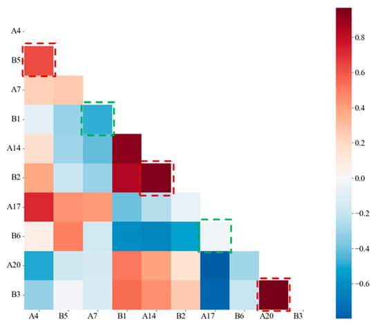 Correlation matrix of main frequency of different channel. (The dashed box indicates the correlation of the dominant frequency signals from sensors at the same location, with red representing high correlation and green representing low correlation.).