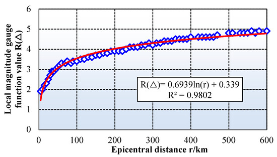 Step 1: Initially, a fitting formula correlating epicentral distance with the local gauge function value is derived from the data presented in the local gauge function value table within GB 17740-2017. This relationship, depicted in Figure 6, exhibits a high degree of fit, with a correlation coefficient of 0.98.