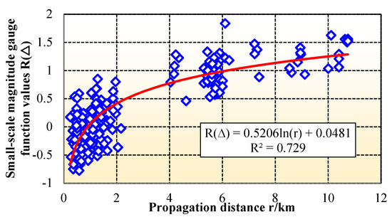 Step 3: As shown in Figure 7, using the R(∆) values determined in Step 2 for short distances, the coefficients α = 0.5206 and β = 0.0481 are determined by the linear least squares method, and the local magnitude gauge function value under small scale is finally determined.