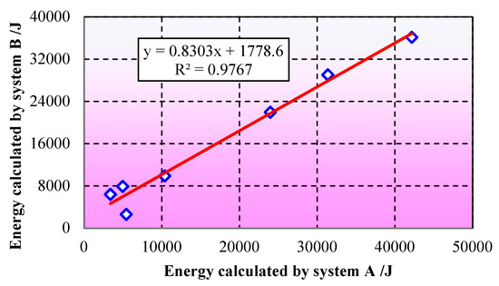 In the formula, a is taken as 4.8 and b as 1.5 in Equation (2). The energy of the blasting signal was calculated using the newly proposed formula, with the results presented in Table 10. Figure 8 illustrates the linear fitting relationship between the energy calculation results from both systems. Notably, upon implementing the new calculation formula, the energy computations from System A and System B exhibit only minor discrepancies. Furthermore, the linear correlation coefficient reaches an impressive 0.99, indicating a remarkably high degree of consistency and thereby validating the effectiveness of the integrated algorithm.