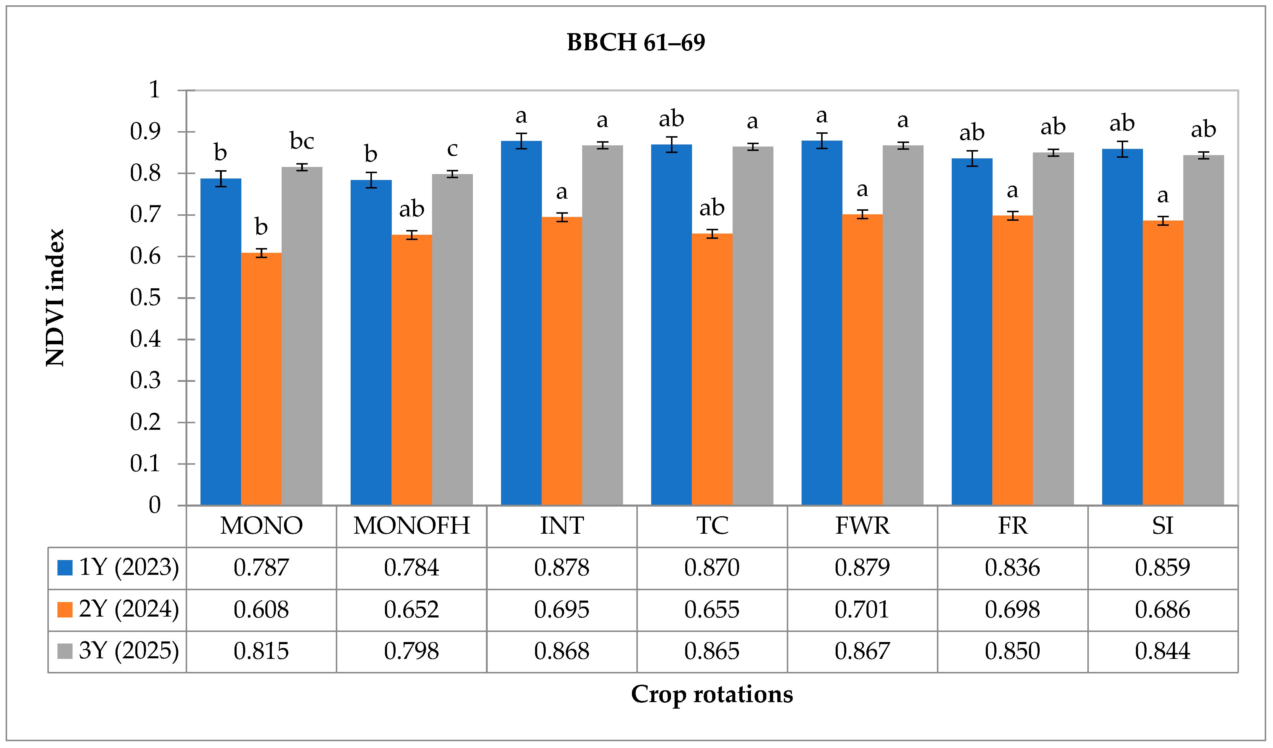 3.1. NDVI Indexes of Winter Rye at BBCH 61–69