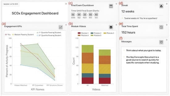 Screenshot of the Learning Analytics Dashboard (LAD) shown to learners in Group A (dashboard without feedback). Components (a–e) provide low-inference visualizations of engagement and pacing, while component (f) delivers messages. Groups A and B shared identical visual components; however, Group A received only generic motivational or course-related messages, whereas Group B received more personalized, ARCS-structured feedback. The example shown corresponds to a highly engaged learner (152 h total) and was used for illustrative purposes.