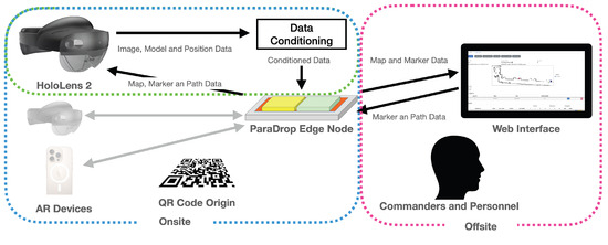 Over the past ten years, new technologies in the fields of virtual reality, augmented reality, digital twins, computer vision, wearable technologies, and edge computing have emerged through lower-cost, consumer-available hardware and devices. These advancements have created new opportunities for developing applications, using these technologies, to benefit first responders [3,4,5,6]. Among several emerging technologies, augmented reality (AR) and edge computing serve as two technologies that could bring some of the greatest benefits to first responders. AR brings the possibility of adding supplemental information to a first responders’ visual field of view, thus helping them with decision making in challenging environments. Edge computing serves as the central technology for sharing information between peers in the hazardous environment.