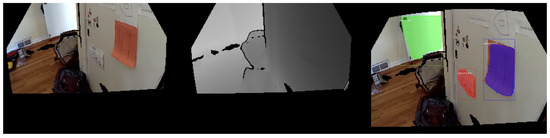 Aligned captures from our HoloLens 2 application. Left: A color image indoors showing a hallway and door. Middle: A depth image captured and aligned at the same time as the color image, such that pixel correspondences are readily available. Right: A color image showing the three segmentation and identification results overlaid with contour highlighting.