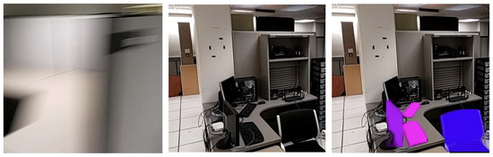 Data-conditioning evaluation Left: An image distorted by motion blur captured by HoloLens 2 and discarded after a low response in the truncated object processing on the headset. Middle: An image that produces a higher response in the truncated object detector is transmitted to the edge server for image segmentation analysis. Right: The edge contour segmentation annotations returned from the server; purple shows a monitor, blue shows a chair, and pink shows keyboards.