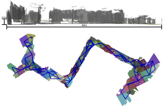 Top: Building-scan example with significant vertical drift toward the left side of the image. Bottom: Extraction of walkable subcomponents of the spatial mesh. Each colored cell is a distinct subcomponent itself, comprising a triangle mesh. Blue lines indicate the inferred navigation graph. The scale of the map is approximately 44 m in length between the furthest points, and the vertical drift measures 0.6 m between the highest and lowest points.