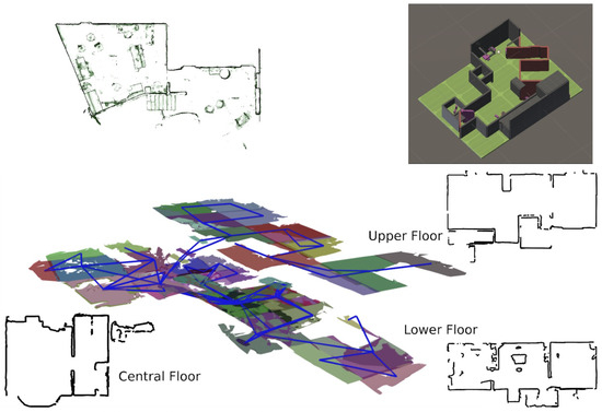 ECM is an attractive data structure for efficient navigation and compares favorably in experiments [37] to other methods, such as voxel-based methods, owing to its relative sparsity. However, the process of constructing an ECM from sensor data presented a few challenges. The first challenge was that the data collected from multiple headset scans was shown to produce vertical errors, as shown in Figure 4. We observed, in some experiments, that the headset estimate of vertical position would drift up or down over time, which leads to a poorly aligned composite mesh. We were able to identify and compensate for vertical drift to some extent by projecting user traces down to the nearest horizontal mesh element. Selecting the topmost layer produces a consistent and feasible walking surface for path planning, which is primarily concerned with movements in the horizontal plane. However, our compensation does not correct the underlying inaccuracy of the map, which requires further work similar to the optimization in bundle adjustment. In the example below, vertical drift is seen more strongly on the left side of the image than the right, appearing as multiple stacked floor meshes. The selected floor for navigation mesh is the yellow- and green-tinted topmost layer.
