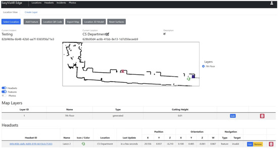 Each device sends its own local 3D map of the space, exported from the HoloLens’ Mixed Reality Toolkit Software Development Kit (MRTK SDK) spatial awareness subsystem. This data is transferred as PLY files to the edge server. The server collects the PLY files from one or more headsets and integrates them into the map of the environment by cleaning the scans and removing areas of overlap. The integrated map can be visualized as a 3D model or as a series of 2D floor plans. Each AR device is capable of sending camera image data to the server in the JPEG format. These images are spatially located in the unified coordinate system. This allows for map annotations to indicate where the images were captured, for computer vision algorithms to be run in the context of a location, and for providing the ability to create color 3D models of the space.