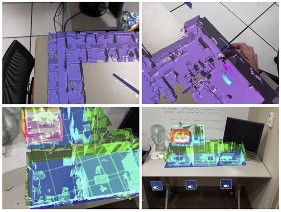 To visualize the server-generated floor plan of the space, several techniques were explored. Beyond the simple SVG floor plan described, another approach to rendering top–down maps was developed, which better highlights objects and potential obstacles in the environment and which also readily incorporates data from multiple headsets (Figure 5 Top Left). This technique makes use of surface shaders, which can be run on either the edge host CPU or GPU and uses normal vectors from the environment mesh captured by the HoloLens headsets to calculate a continuous color gradient based on changes in local surface geometry. The example shown in Figure 5, which demonstrates an office workspace, visually reveals different types of furniture in the environment, including a couch, table, and chairs, with a small stairway readily apparent. This type of map visual is potentially too information-dense to use in a heads-up display but may be more suitably displayed in a top–down command dashboard to give outside users a better understanding of the interior environment. It may also enable users to refer to room features during verbal communications, e.g., by asking the team to explore what lies beyond the stairs in the map shown below.
